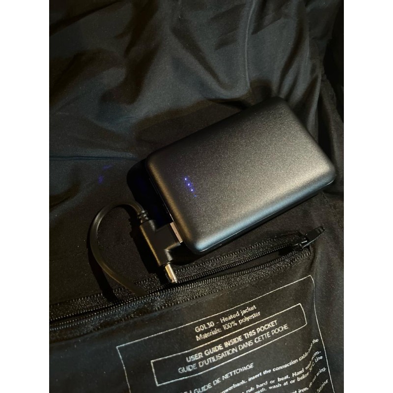Un powerbank de 10 000 mAh est inclus et se trouve dans la poche intérieure. Un second peut être livré (voir option) pour doubler la capacité.