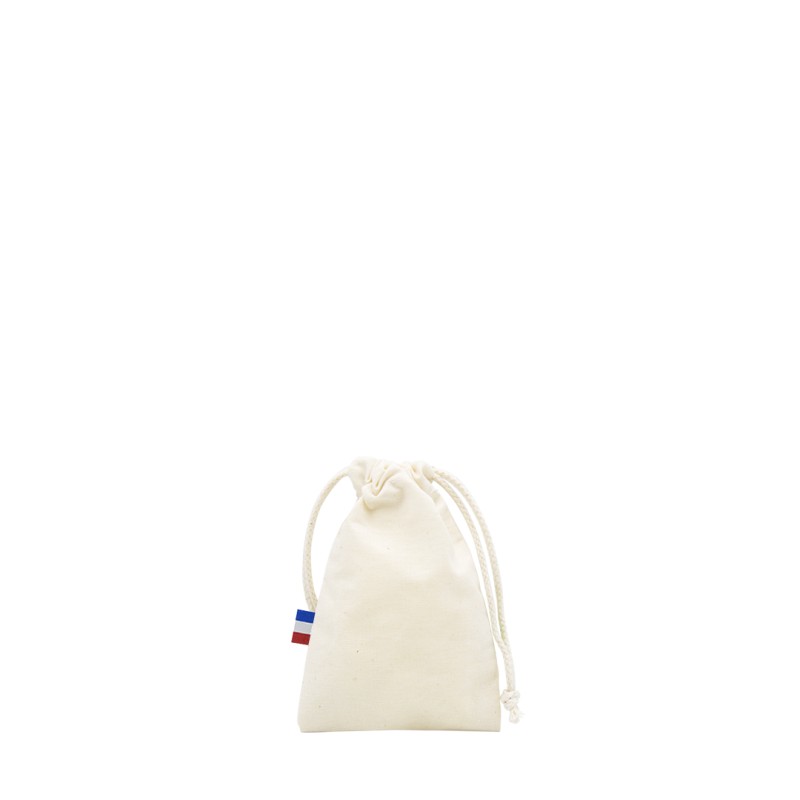 Pochon Loïc S écru, Tissage matière France – Confection française, Tissu 100% coton Biologique de 150g – coloris écru, Dimensions 10x15cm avec 2 cordons de 3,5mm d'épaisseur, Etiquette intérieure de composition Bonjour François + galon BBR sur le côté du sac, 300 pièces par carton