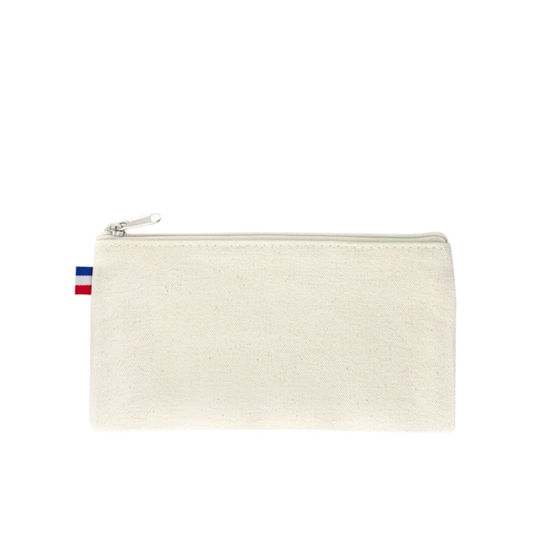 Trousse Andréa écru certifiée GOTS, dimensions 22x12cm, Confection France, en 100% coton BIO - tissé France, avec ZIP. Étiquette intérieure de composition avec logo Bonjour François, galon BBR sur le coté de la trousse. 300 pièces par carton. Demi-natté 240g/m².