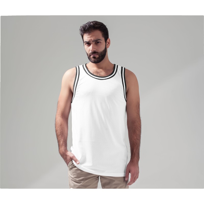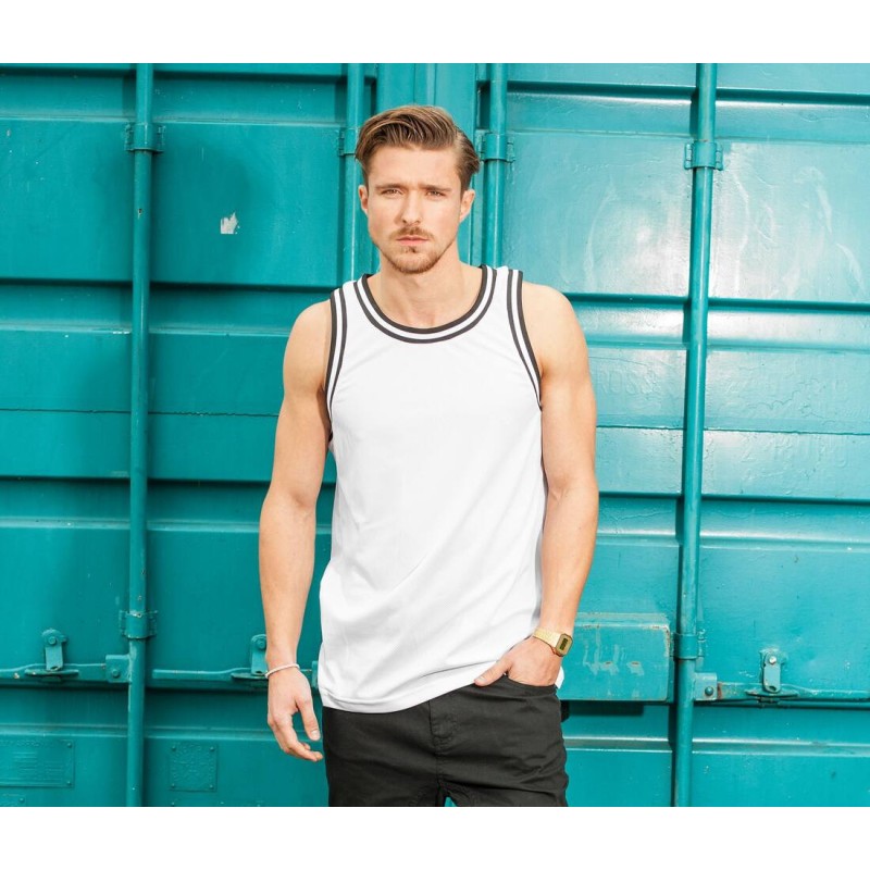 Débardeur inspiré des maillots traditionnels. Coupe longue. Col et emmanchures contrastés.