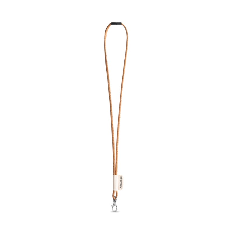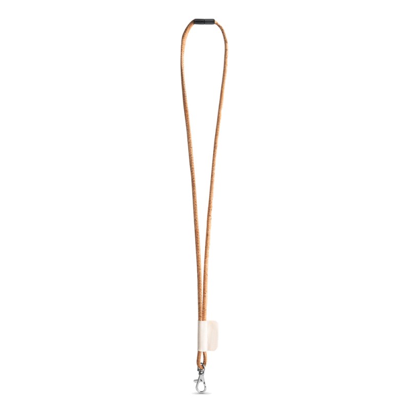 Lanyard personnalisé en liège. Lanyard Cork Long complété par les accessoires et extras suivants: étiquette en coton 43 x 15 mm, Mousqueton 9 mm et verrou de sécurité. Les prix indiqués comprennent la personnalisation en sérigraphie en 1 couleur/1 position. ø5 x 470 mm