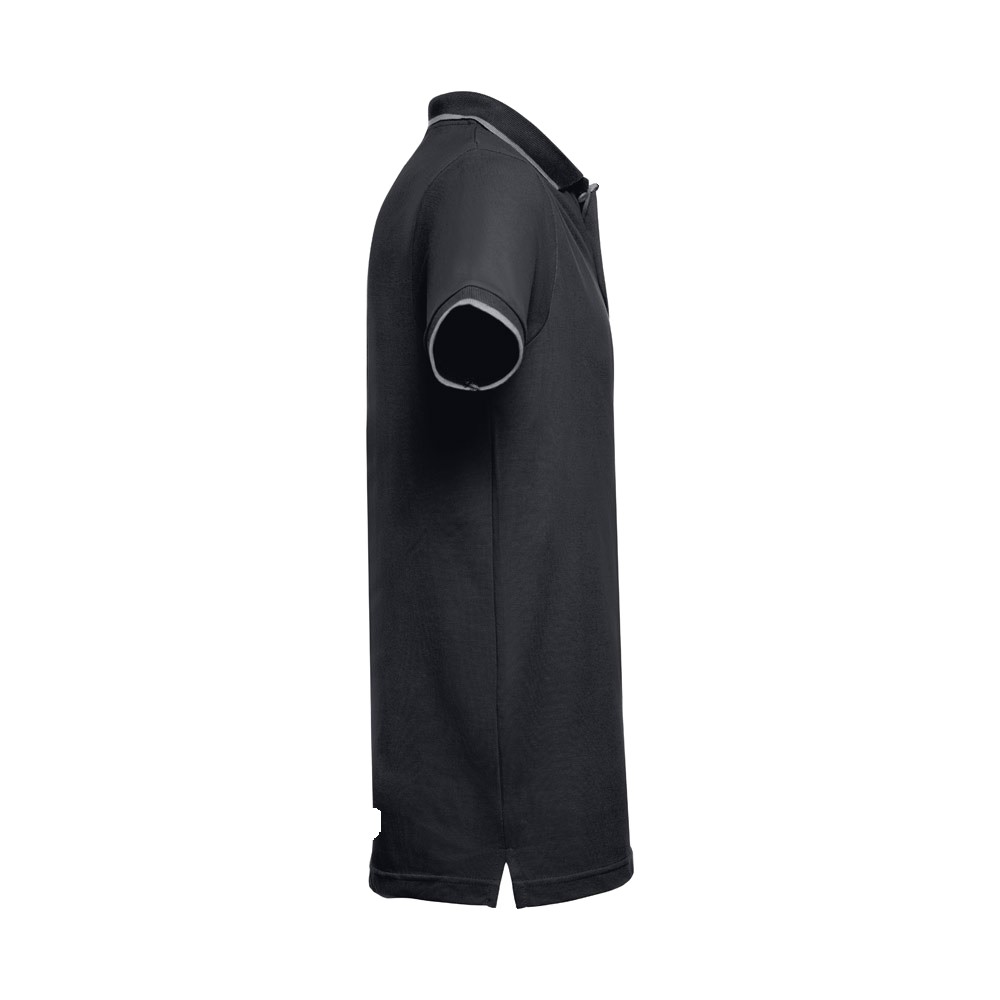 Polo pour homme à manches courtes bicolore en maille piquée 100% coton (210 g/m²) (couleur 183 : 85% coton/15% viscose). Contraste bicolore sur le col, les manches et la patte de boutonnage. Contient un col et des manches côtelés. Patte de boutonnage renforcée avec 3 boutons de couleur contrastée (bouton de remplacement inséré dans la couture intérieure). Pièce slim fit avec de petites ouvertures latérales au bas. Tailles: S, M, L, XL, XXL