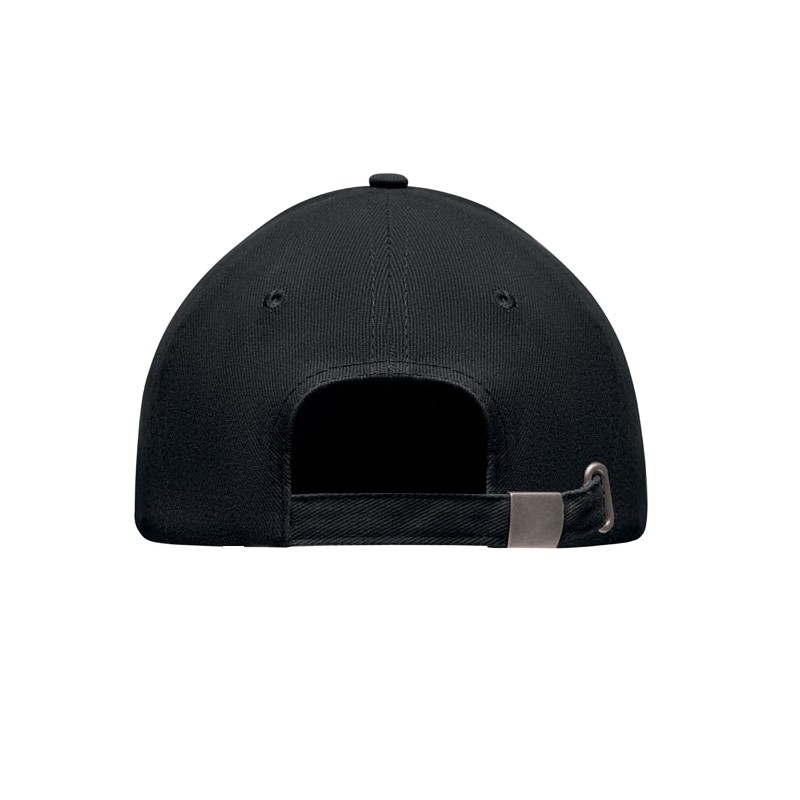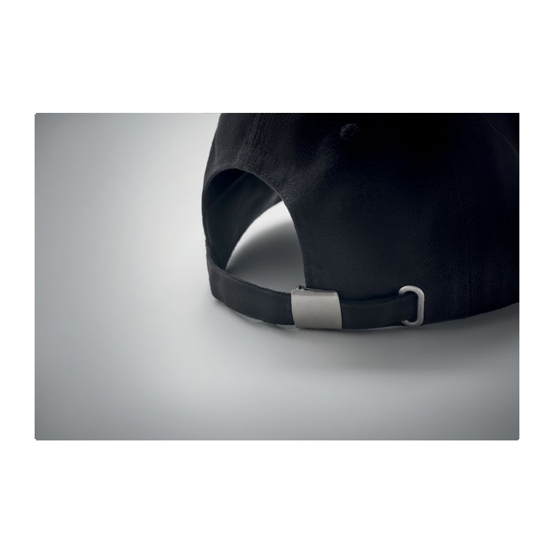 Casquette de baseball à 5 pans en coton sergé brossé lourd 260 gm/m2 avec boucle en acier argenté. 4 oeillets brodés de couleur assortie. Taille 7 1/4.