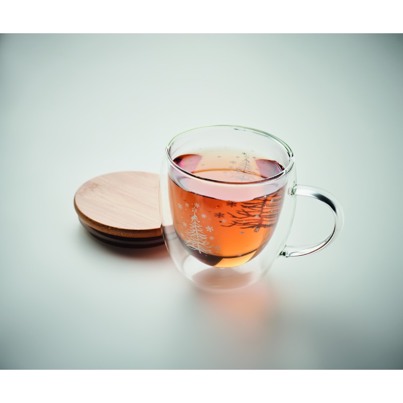 Tasse en borosilicate à double paroi avec un motif de sapin et un couvercle en bambou. Capacité : 220 ml. Le bambou est un produit naturel, et présente de légères variations de couleur, de décoration et de tailles.