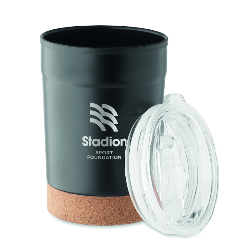 Gobelet à double paroi en acier inoxydable à l'extérieur et en PP à l'intérieur, avec base en liège et interstice coulissant pour boire. Sans fuite. Capacité : 300 ml.