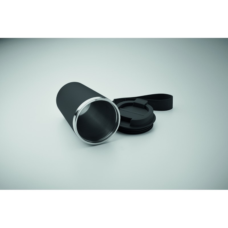 Gobelet à double paroi en acier inoxydable recyclé (90 % d'acier inoxydable recyclé et 10 % d'acier inoxydable) avec couche extérieure en PP et bracelet en RPET. Capacité : 350 ml.