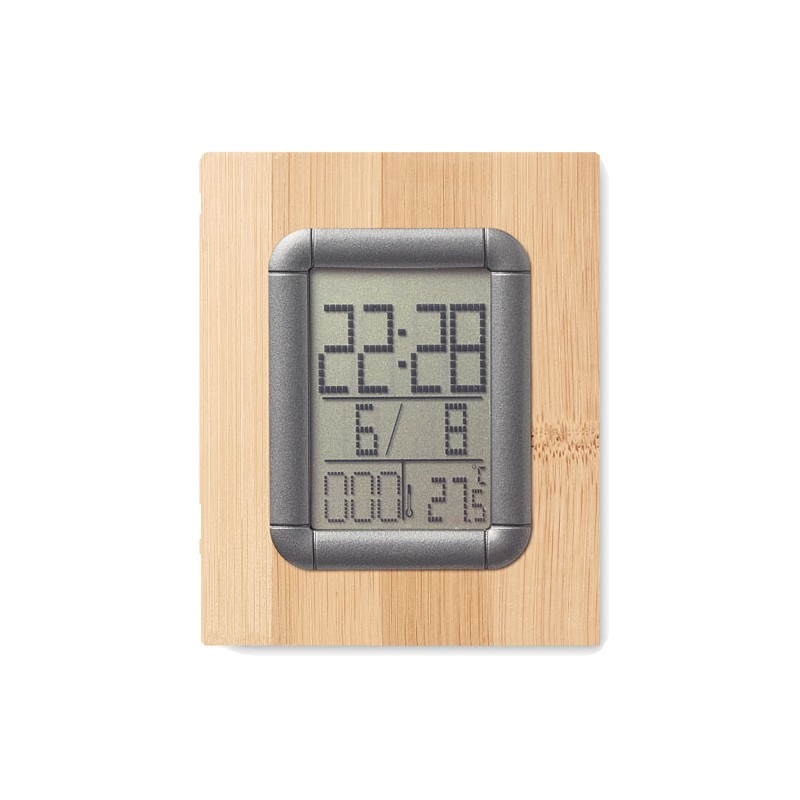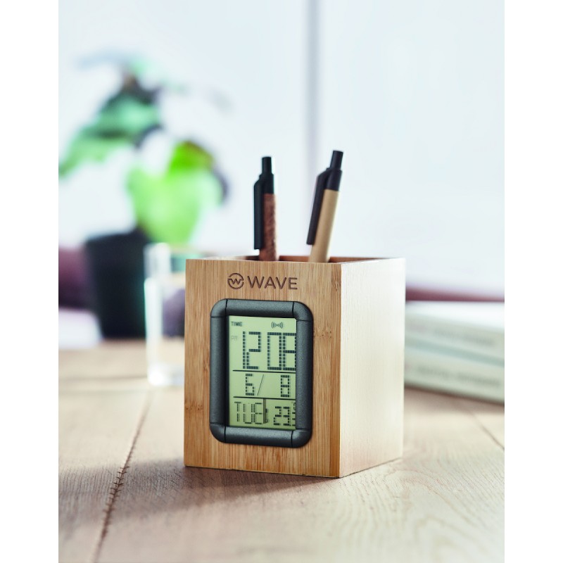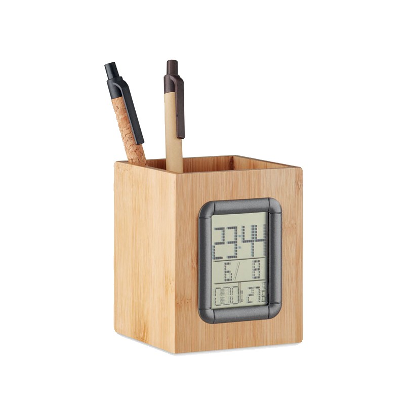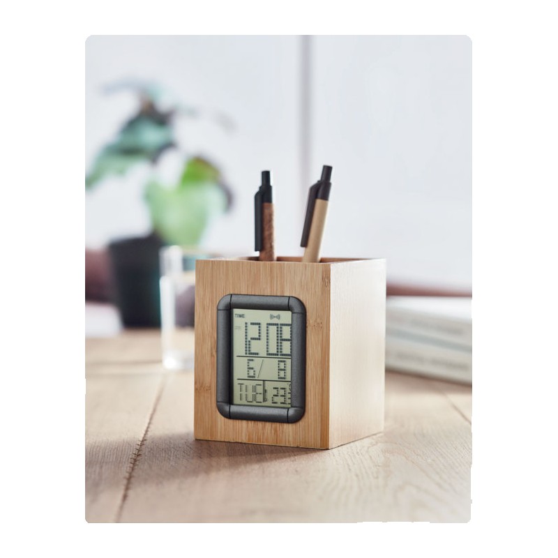 Porte-stylo en bambou avec calendrier, réveil et thermomètre. 2 piles incluses. Le bambou est un produit naturel, et présente de légères variations de couleur, de décoration et de tailles.