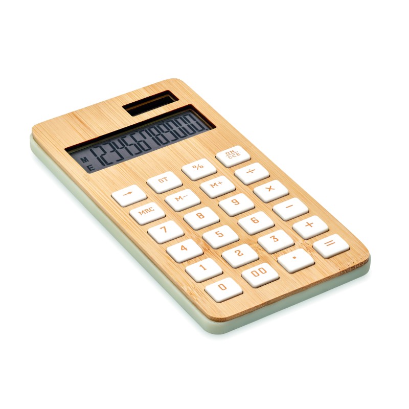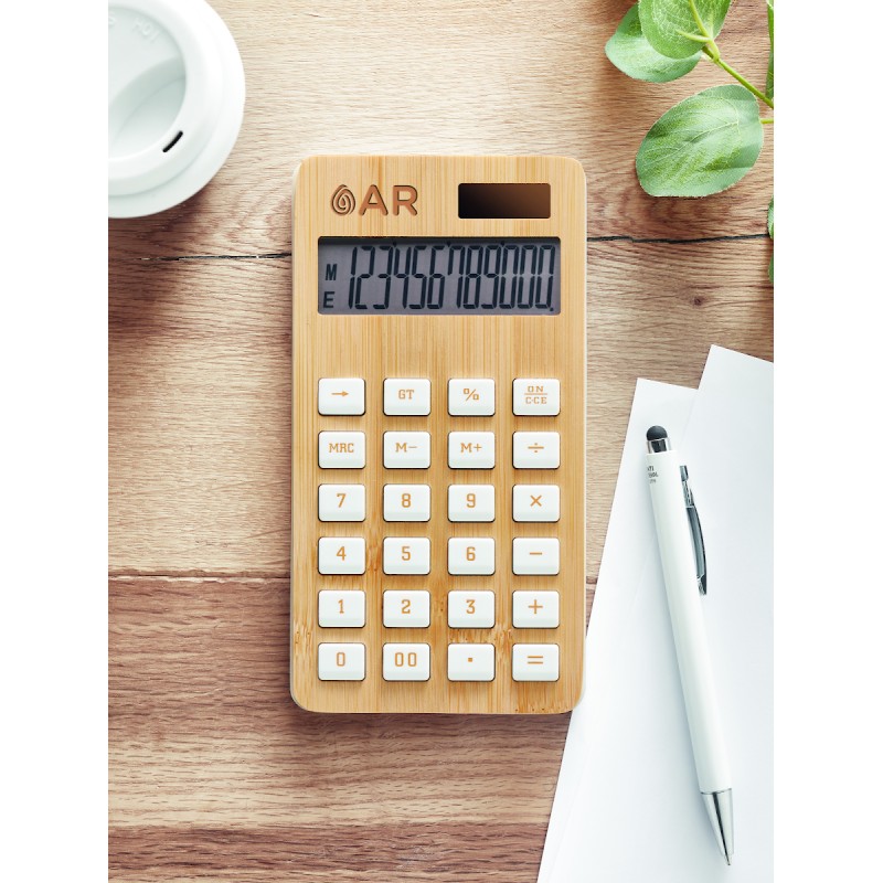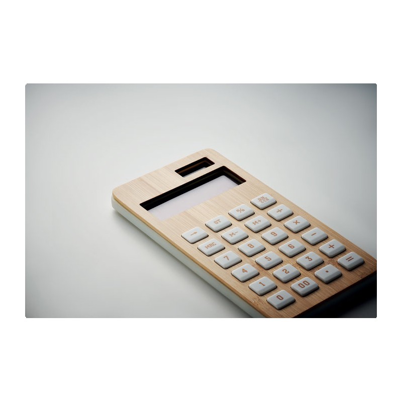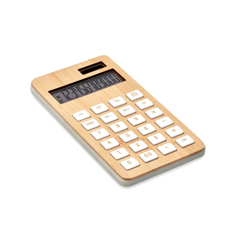 Calculatrice 12 chiffres à double alimentation (pile et solaire) en ABS avec étui en bambou. 1 Pile bouton (LR1131) incluse. Le bambou est un produit naturel, et présente de légères variations de couleur, de décoration et de tailles.