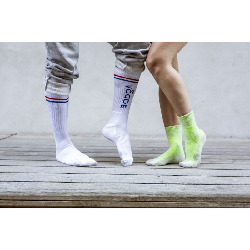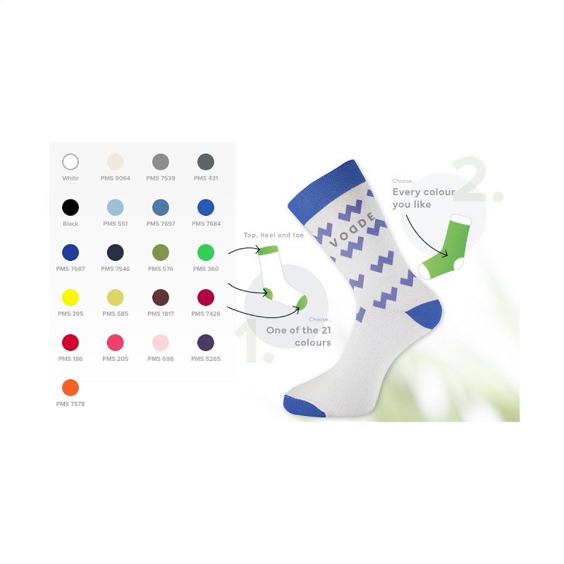 Chaussettes confortables de Vodde fabriquées selon un processus de fabrication basé à 100% sur l'économie circulaire. Ces chaussettes sont composées à 53% de coton recyclé (à partir de morceaux de tissus collectés), à 38% de polyester recyclé (à partir de bouteilles en PET collectées), 6% nylon et à 3% d'élasthanne. Design tricoté et personnalisé inclus. Toutes les chaussettes Vodde sont fournies en par paires avec une étiquette, qui peut être imprimée dans votre propre design en couleur. Vous pouvez ainsi concevoir vos propres chaussettes et elles correspondront parfaitement à n'importe quelle identité d'entreprise. Ces chaussettes fines de qualité, conçues pour un usage quotidien, s'associent parfaitement à une tenue décontractée. Disponibles en tailles M (36-40) et L (41-46). • Quantité minimale de commande : 100 paires de chaussettes par taille. Quantité minimale au total : 200 paires de chaussettes. • En option : Livré par paires dans une boîte (personnalisée) en carton recyclé - possible à partir de 1200 paires de chaussettes. • En portant ces chaussettes, vous contribuez à un monde durable moins pollué. Développé et testé aux Pays-Bas. Fabriqué dans l'UE. • La base des chaussettes est faite de fil recyclé et est proposée dans une couleur standard. Vous pouvez choisir parmi 21 couleurs standard de fil recyclé. Tout motif de la base, de la manchette, du talon et de la pointe peut être réalisé dans la couleur de votre choix. • La société néerlandaise Vodde réutilise des textiles mis au rebut pour fabriquer de nouveaux produits conçus par des créateurs néerlandais. Vodde fabrique son fil à partir de coton collecté par des "rag farmers" (récupérateurs de chiffons) locaux et à partir de chutes de coupe issus de la production textile dans les pays européens où Vodde fabrique ses propres produits. De plus, des polyesters dérivés de bouteilles en PET, du nylon, des filets de pêche et d'autres déchets collectés sont également utilisés.