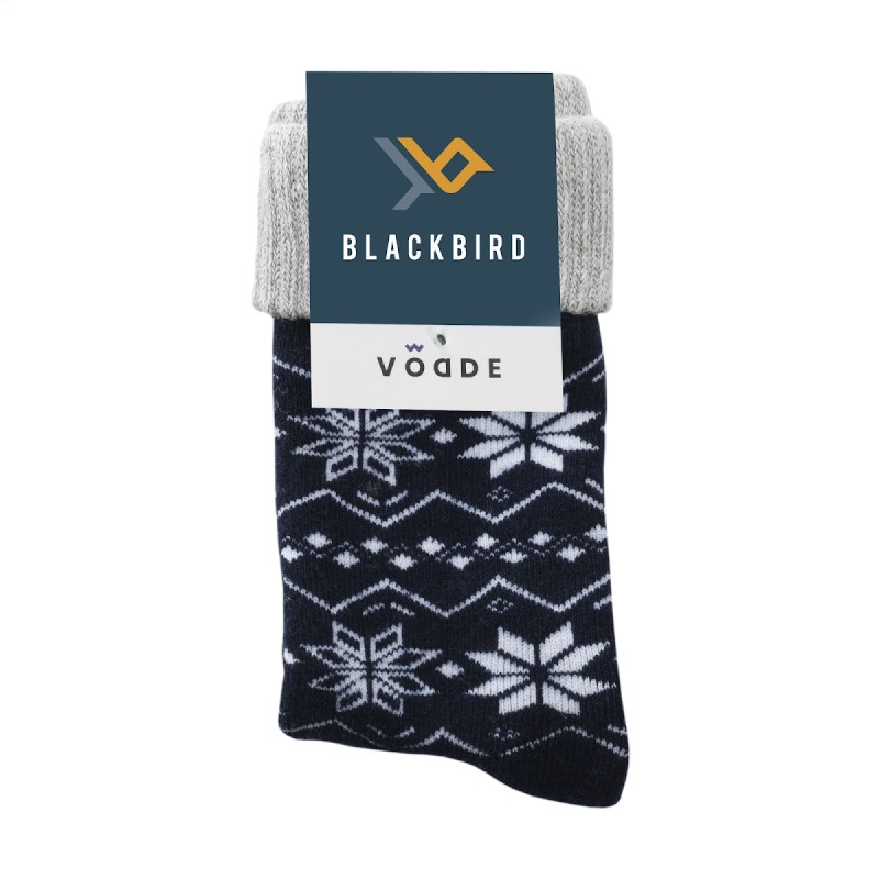 Chaussettes d'hiver confortables en laine de la marque Vodde. Les chaussettes présentent un motif d'hiver standard, tricoté. Un logo peut être tricoté au bas de la chaussette dans la couleur de votre choix. Idéales comme chaussettes d'intérieur. • Les chaussettes sont fournies en par paires avec une étiquette, qui peut être imprimée dans votre propre design en couleur. • Ces chaussettes sont composées à 25% laine recyclée, 55% RPET, 17% polyamide et 3% élasthanne. Taille unique. Laver jusqu'à 30 degrés. • Quantité minimale au total : 100 paires de chaussettes. • En option : Livré par paires dans une boîte (personnalisée) en carton recyclé - possible à partir de 1200 paires de chaussettes. • En portant ces chaussettes durables, vous contribuez à un monde moins pollué. Développé et testé aux Pays-Bas. Fabriqué dans l'UE.