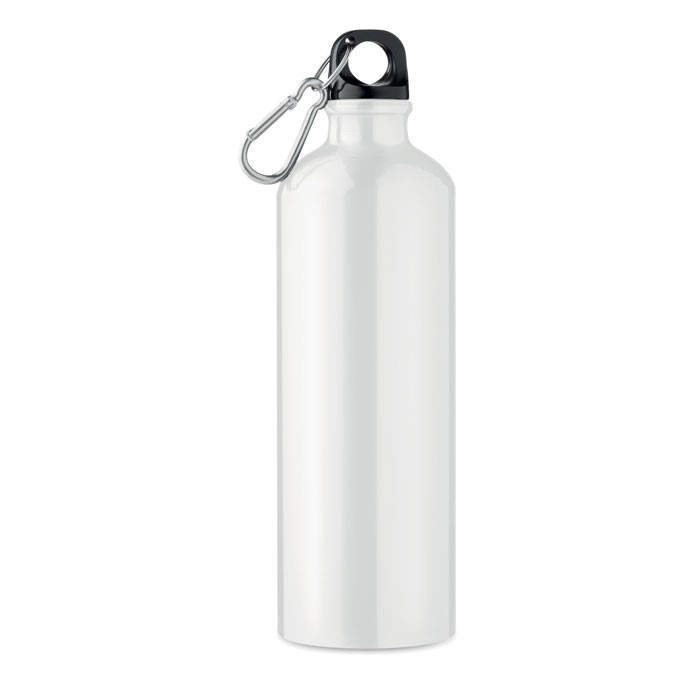 Gourde avec mousqueton 800ml. Bidon simple paroi avec couvercle à visser. Ce mousqueton ne convient pas à la pratique de l'escalade. Aluminium - Dimensions Ø 7,3 X 25,3 cm - poids 104gr - Marquage Sublimation (15x20 cm)