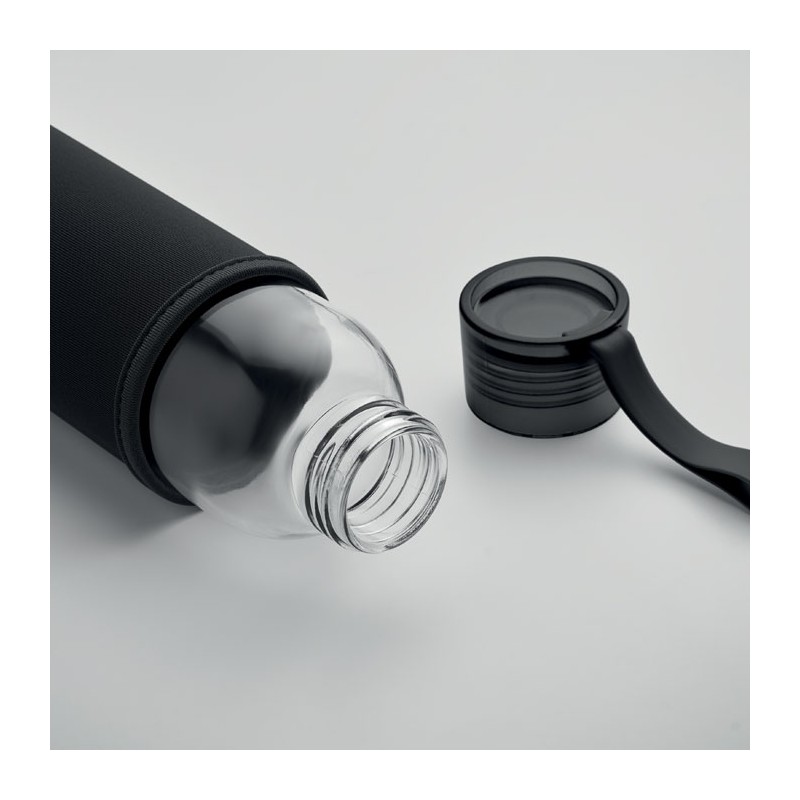 Bouteille en verre recyclé avec pochette en néoprène et couvercle en PP avec cordon en silicone. Anti fuite. Capacité : 500 ml.