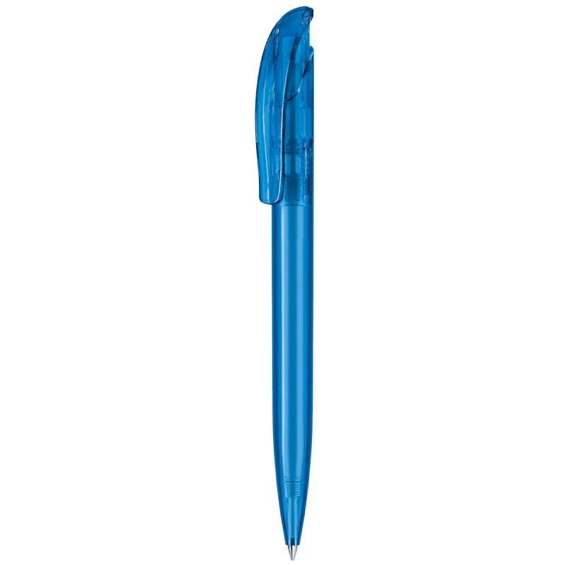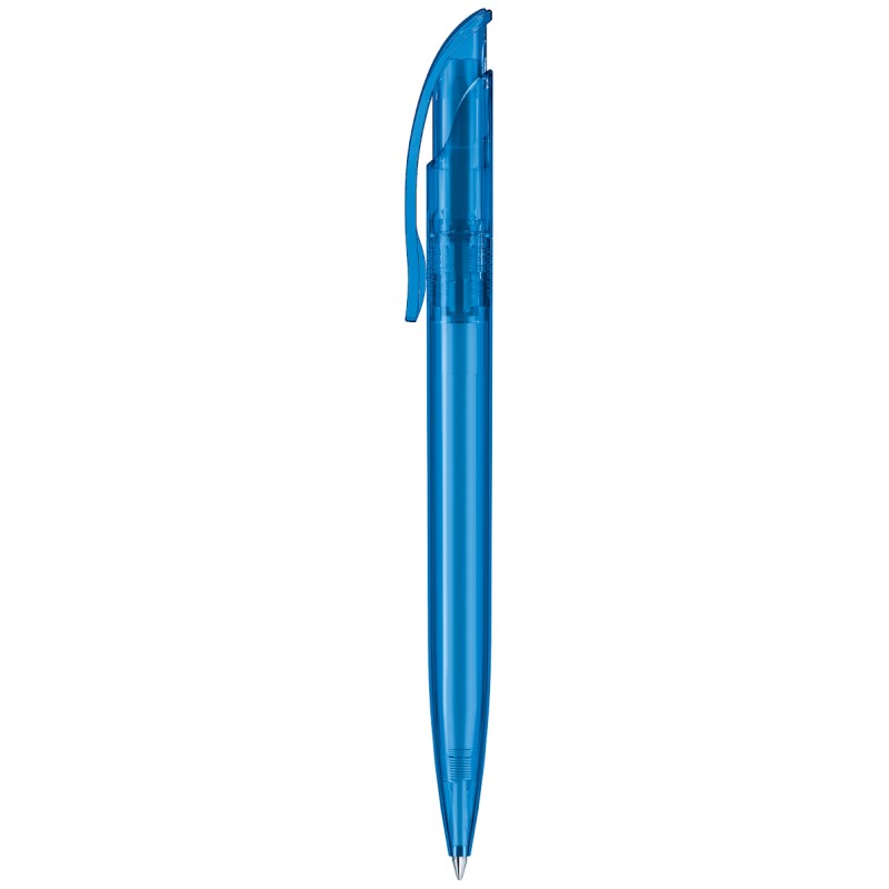 Stylo à bille rétractable avec corps et clip en plastique transparent.