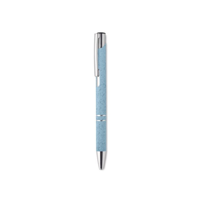 Stylo bille à bouton poussoir en 50% paille de blé et 50% ABS avec armatures en argent. Encre bleue. Types de marquage : tampographie (60 x 7) ou UV. Dimensions: Ø 1 X 13,7 CM