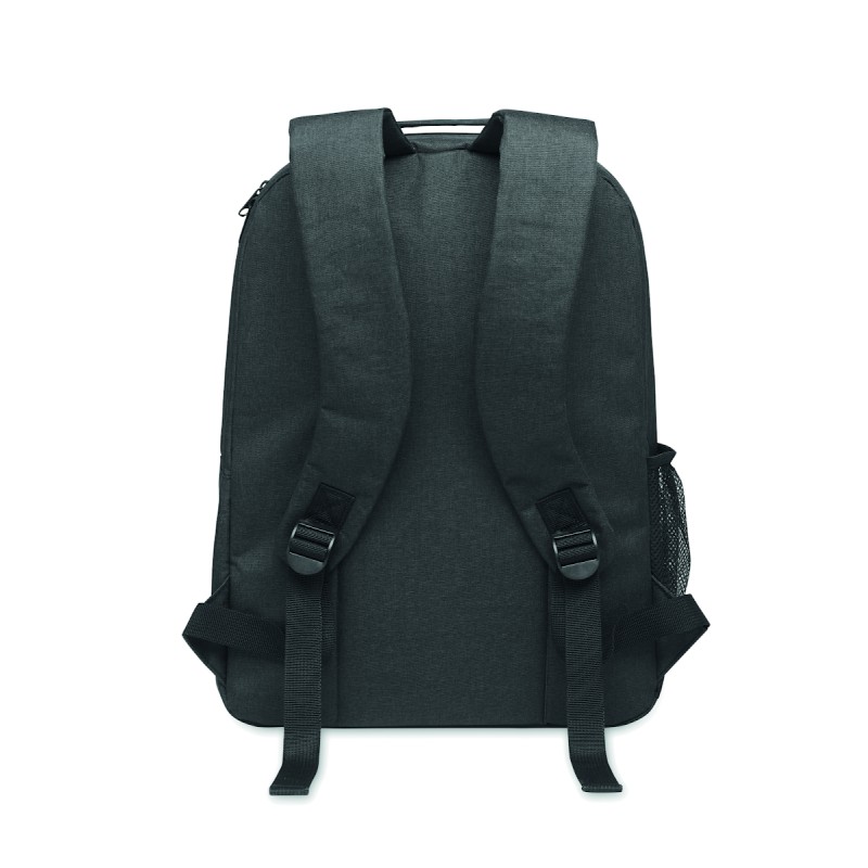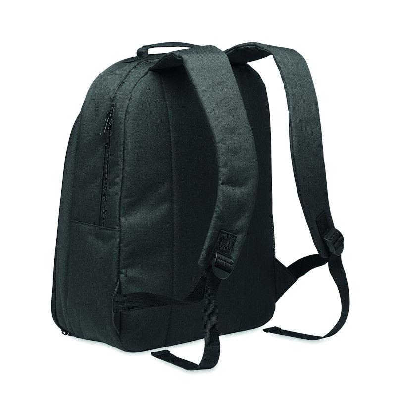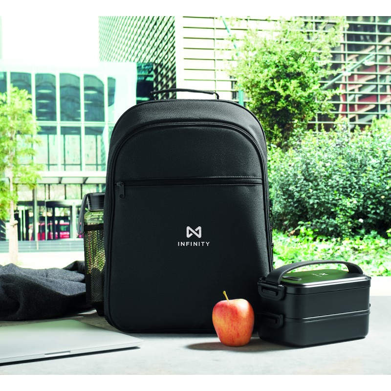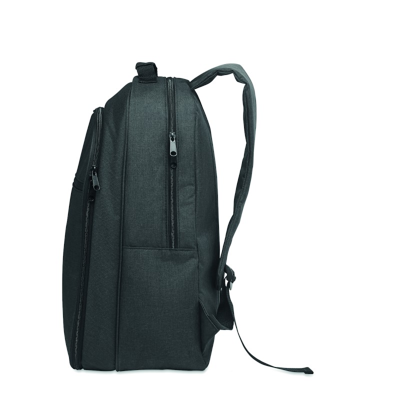 Sac à dos isotherme en 300D RPET avec compartiment pour ordinateur portable de 15 pouces. Poche frontale zippée et un compartiment latéral en filet.