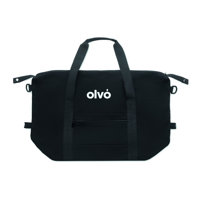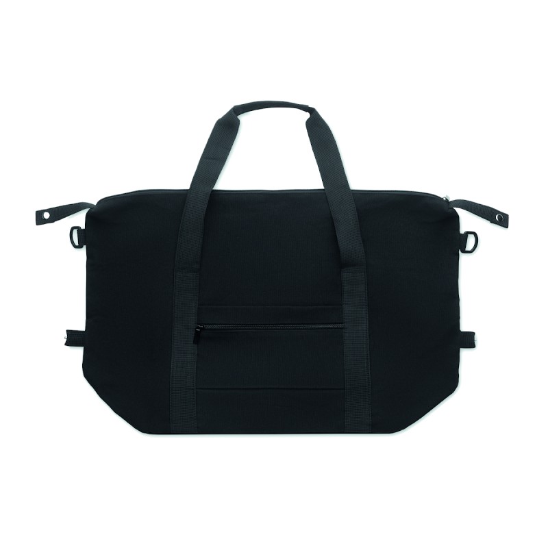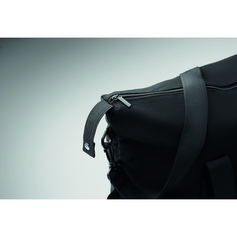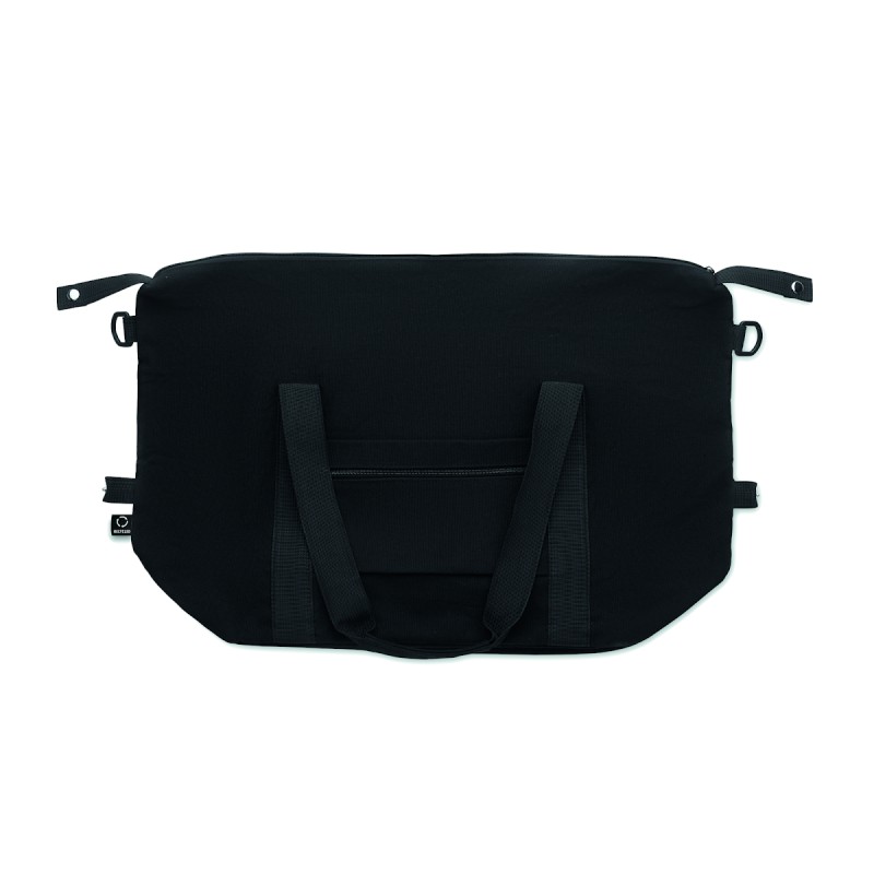 Sac de week-end en coton recyclé de préconsommation et polyester recyclé (70 %/30 %) avec doublure en polyester 210D RPET. Comprend une pochette avant, une pochette arrière zippée, une bandoulière amovible et réglable et un fond matelassé. Porte-trolley au verso.