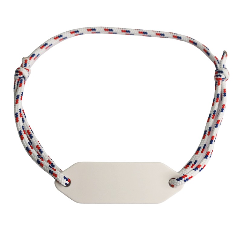 Fabriqué à partir d’un cordon tricolore et d’une médaille personnalisable, ce bracelet à nœuds coulissants s’adapte à tous les poignets.
