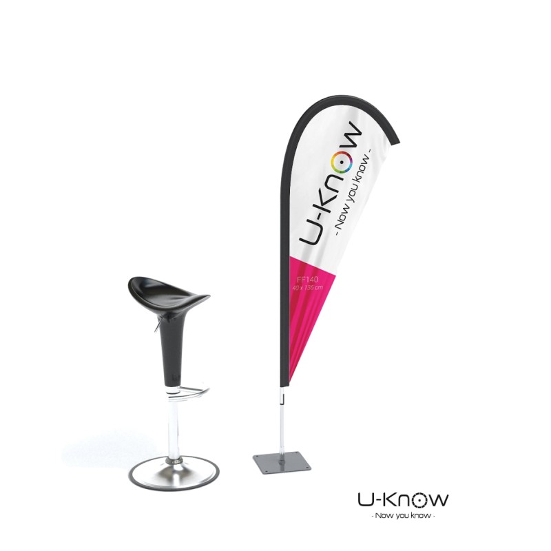 Beach flag goutte d'eau de 1,4m de hauteur. Voile oriflamme en matière 100% polyester 115g/m². 2 techniques d'impressions possibles : numérique ou sérigraphique (MOQ de 50 pcs en sérigraphie). En impression recto seul, le visuel est visible sur l'autre côté par transparence. En impression numérique, il est possible d'imprimer en recto/verso ; une feuille occultante insérée entre les deux côtés permet d'avoir une meilleure lisbilité. Le fourreau noir de la voile est renforcé et fabriqué dans un polyester Oxford 300 D. Le mât est en fibre de verre (très résistant). Les mâts se fixent sur tous les pieds de la même manière. L'axe de rotation présent sur les pieds pivote à 360°. Les voiles se tendent sur tous les mâts grâce à un élastique. Utilisation intérieure exclusivement. Garanti pour un vent inférieur à 70 km/h..Structure disponible sur stock dans notre entrepôt parisien, impression réalisée après validation de la commande