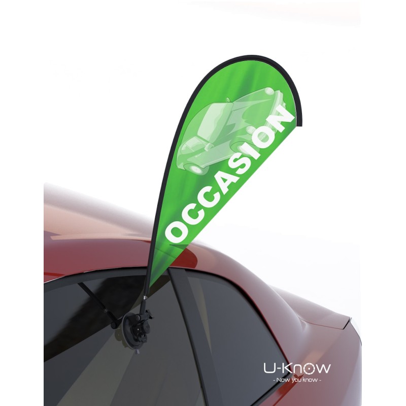 Oriflamme, goutte d'eau de format 24x59cm. Fixation du mât par ventouse, angle de fixation ajustable. Matière 100% polyester 115g/m². Impression quadri sublimation numérique sur le recto seulement. Impression traversée visible des 2 côtés. Mât en fibre de verre.