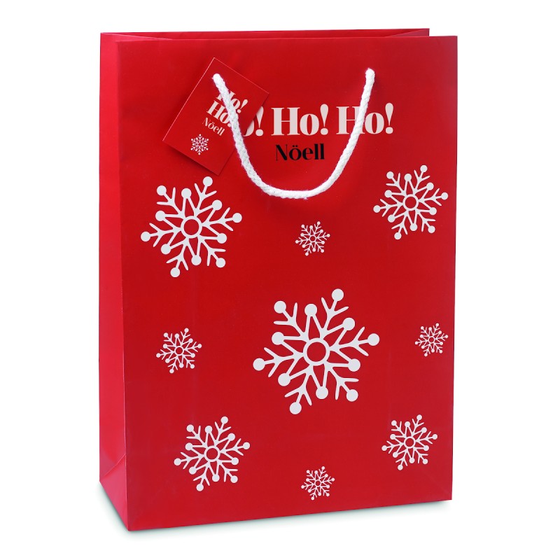 Elégant sac cadeau en papier décoré de motifs de flocons de neige. Petite carte message incluse. Grand modèle. FSC®-certified | FSC 100%, P5.3, FSC-C213206