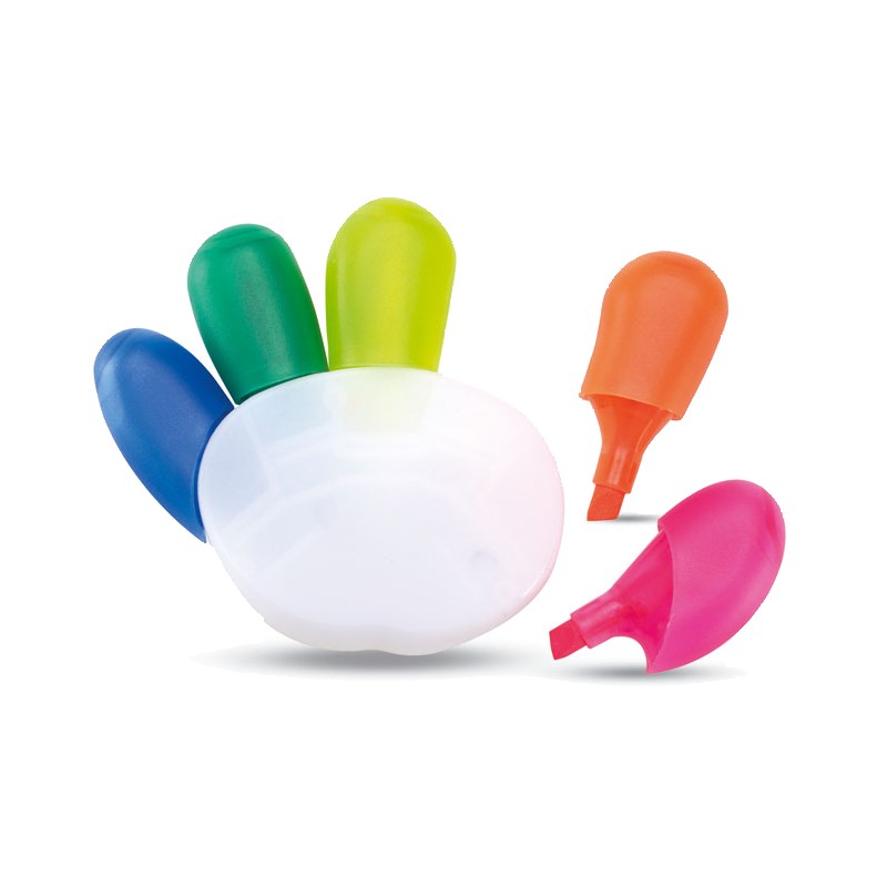 Surligneur 5 couleurs en forme de main. Grande surface d'impression.