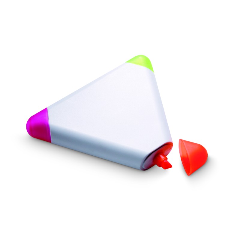 Surligneur en ABS de forme triangulaire. Trois couleurs d'encre : jaune, fuchsia et orange.
