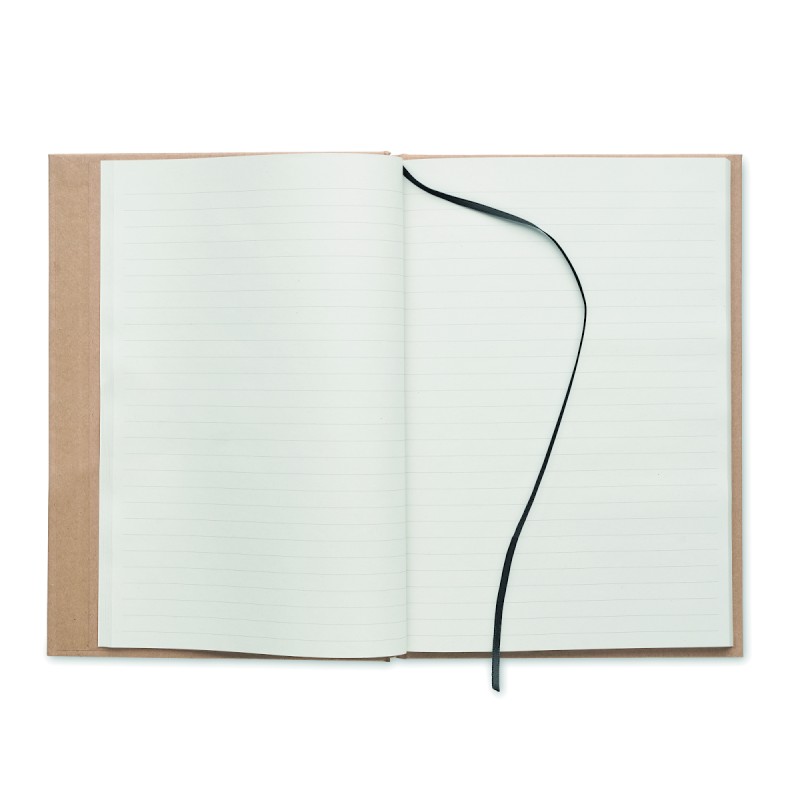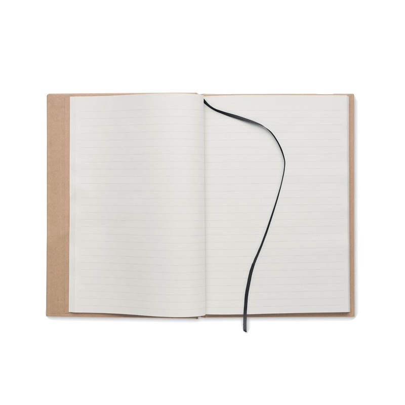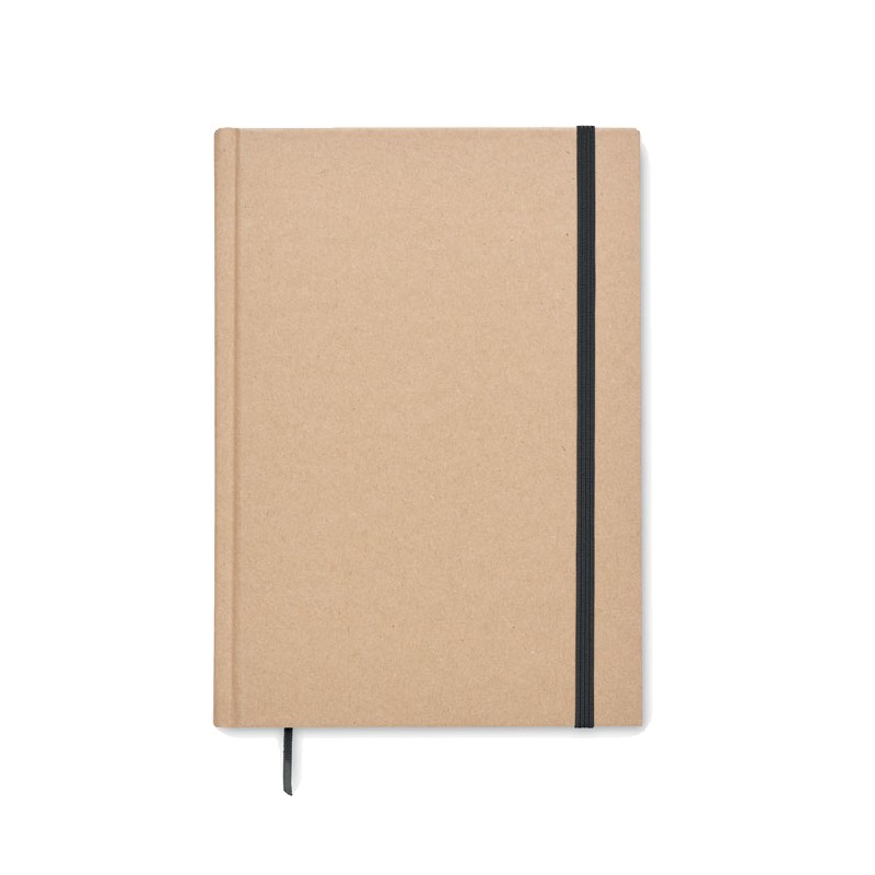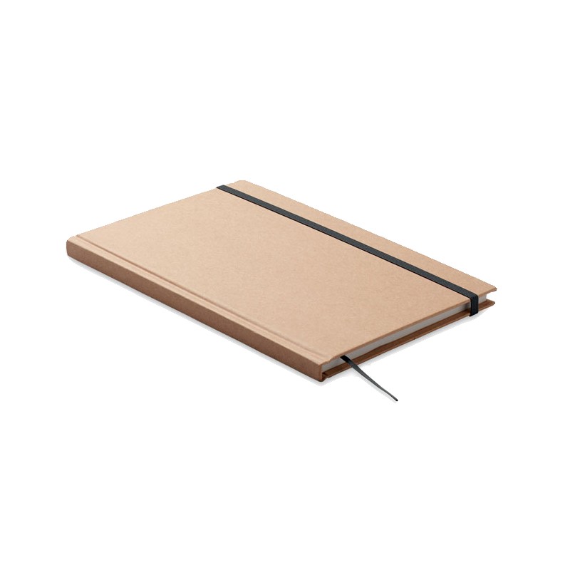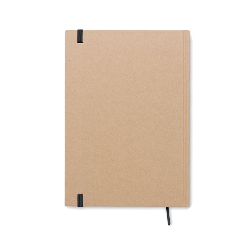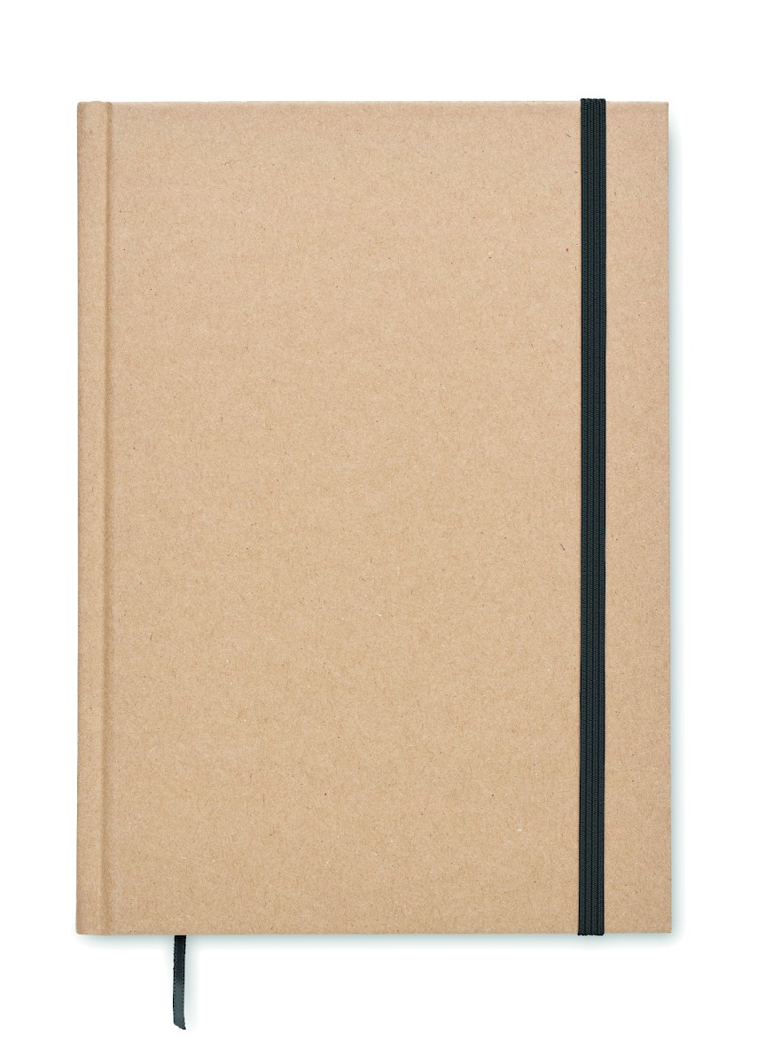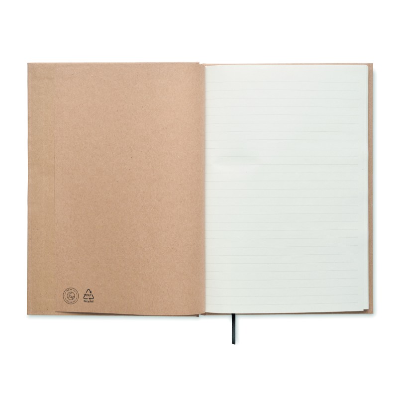 Cahier A5 avec couverture rigide en carton recyclé. Relié par un étui. 200 pages lignées en papier recyclé (100 feuilles/80 gsm). Bande élastique de fermeture et ruban marque-page. Fabriqué dans l'UE.
