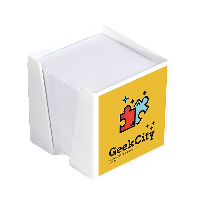 Porte bloc papier. Cube avec bloc papier 89 x 89 x77 mm environ 700 feuilles, issu de forêts gérées durablement. Marquage possible sur 1, 2 et/ou 3 faces en 1 couleur ou plus, ou Quadri-Numérique. Livré en carton avec cloisonnement individuel. Fabrication française.