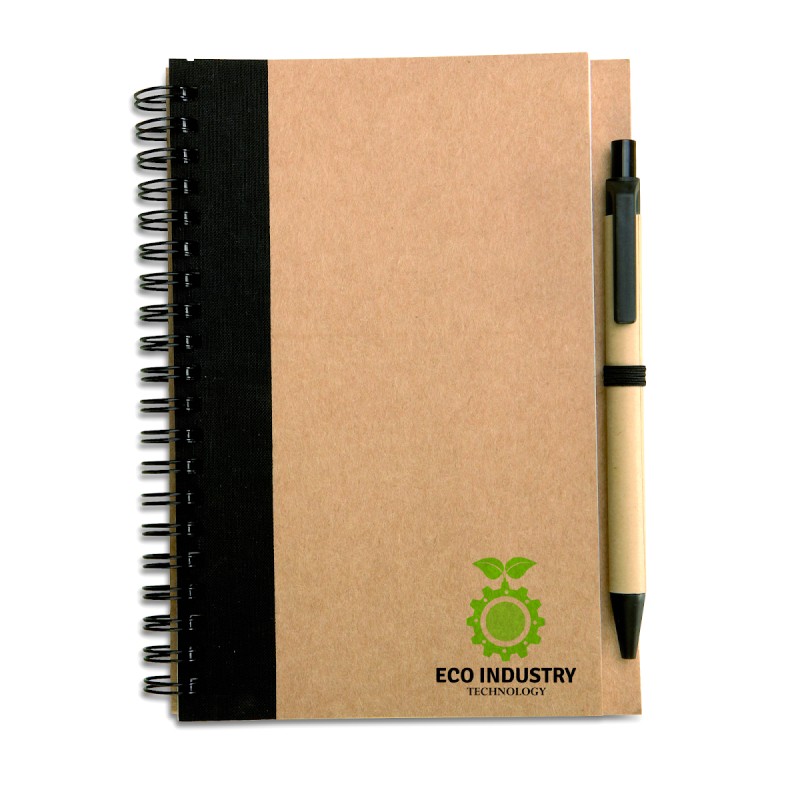 Carnet à spirale en papier recyclé avec stylo assorti. 140 pages en papier recyclé ordinaire (70 feuilles). Stylo à bille à bouton poussoir assorti en carton recyclé et plastique biodégradable. Encre bleue. Passant à stylo élastique assorti. FSC MIX CREDIT | P7.1 | FSC-C213206