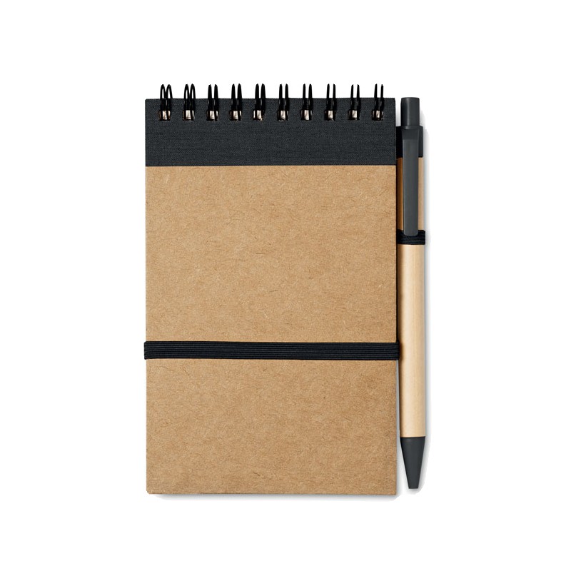 Carnet à spirale en papier recyclé avec stylo assorti. 140 pages en papier recyclé ordinaire (70 feuilles). Stylo à bille à bouton poussoir assorti en carton recyclé et plastique biodégradable. Encre bleue. Bande élastique de fermeture et passant à stylo. FSC®-certified | FSC MIX, P7.1, FSC-C213206