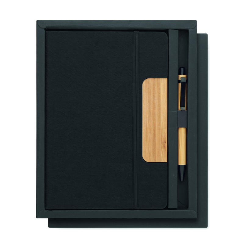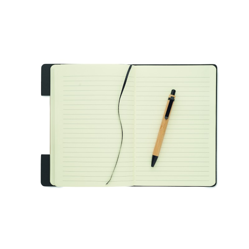 Set de carnets A5 en feutre RPET à couverture rigide avec fonction support de téléphone et stylo à bille en bambou. Reliure cartonnée. 160 pages lignées en papier recyclé (80 feuilles). Fermeture élastique. Marque-page en ruban. Encre bleue.