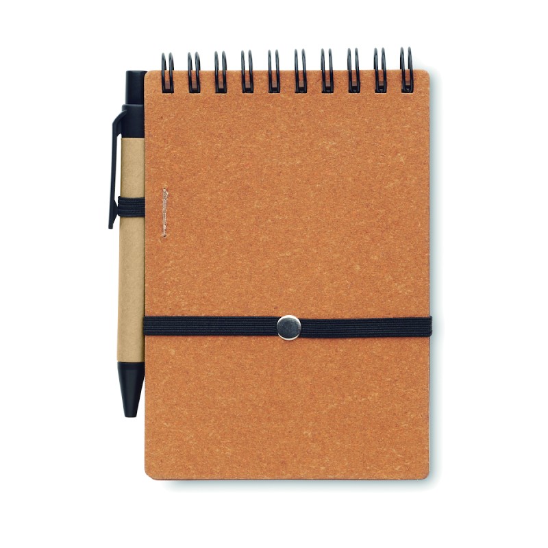 Carnet avec papier recyclé et couverture en PU (70 % de papier recyclé et 30 % de PU). Reliure à spirale. 140 pages lignées en papier recyclé (70 feuilles). Stylo bille à bouton poussoir assorti en carton recyclé et pièces en ABS. Encre bleue. Fermeture élastique et porte-stylo. FSC®-certified | FSC MIX CREDIT, P7.1, FSC-C213206