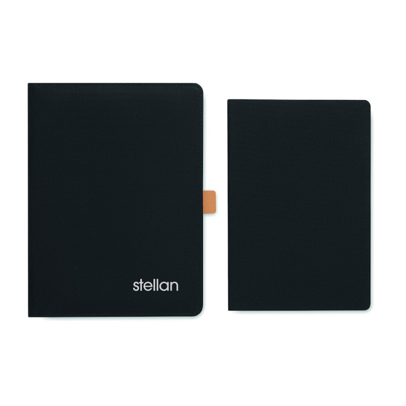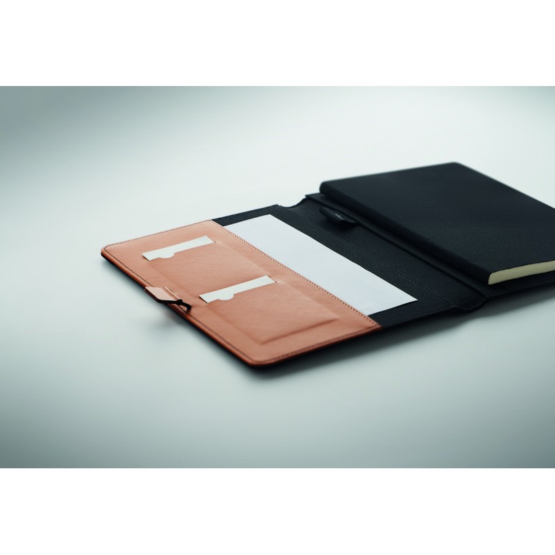 Conférencier A5 en RPET avec détails en similicuir. Carnet A5 remplaçable avec couverture en liège rigide. Reliure cartonnée. 128 pages lignées en papier recyclé (64 feuilles). Porte-stylo. 2 porte-cartes et un grand compartiment. Fermeture élastique avec détails metal FSC®-certified | FSC MIX, P8.6, FSC-C213206