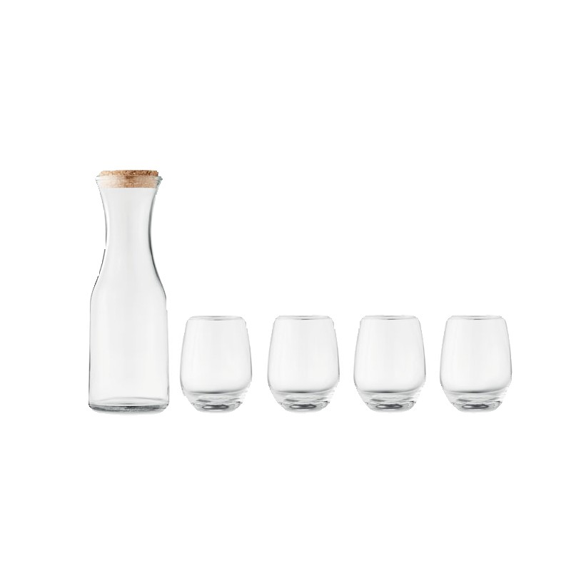 Set de boisson en verre recyclé. Comprenant : Carafe (1L) avec couvercle en liège et 4 verres (420 ml). Le liège est un matériau 100% naturel. En raison de sa structure et de la porosité de sa surface, le résultat final de l'impression par article peut présenter des différences.