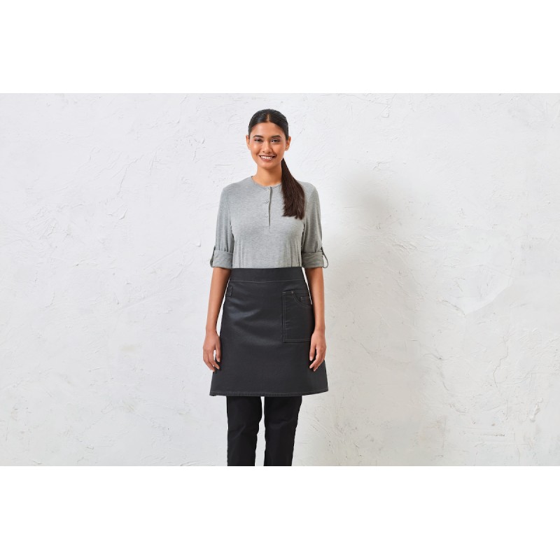 100% coton denim avec une finition acrylique "effet huilé" longue durée qui confère au tablier une apparence de solidité, de durabilité et un certain charme "industriel" reflétant le décor de bon nombre de restaurants. Tablier taille mi-long avec détails d'inspiration "jeans". Grande poche plaquée pouvant contenir une tablette avec finition couture poche classique. Poches extra-larges avec finitions surpiqûres et rivet. Cordons contrastés et système d'attache avec œillet en métal. Détails tissu : poche plaquée et porte torchon. Dimensions : H 50 cm x L 70 cm.