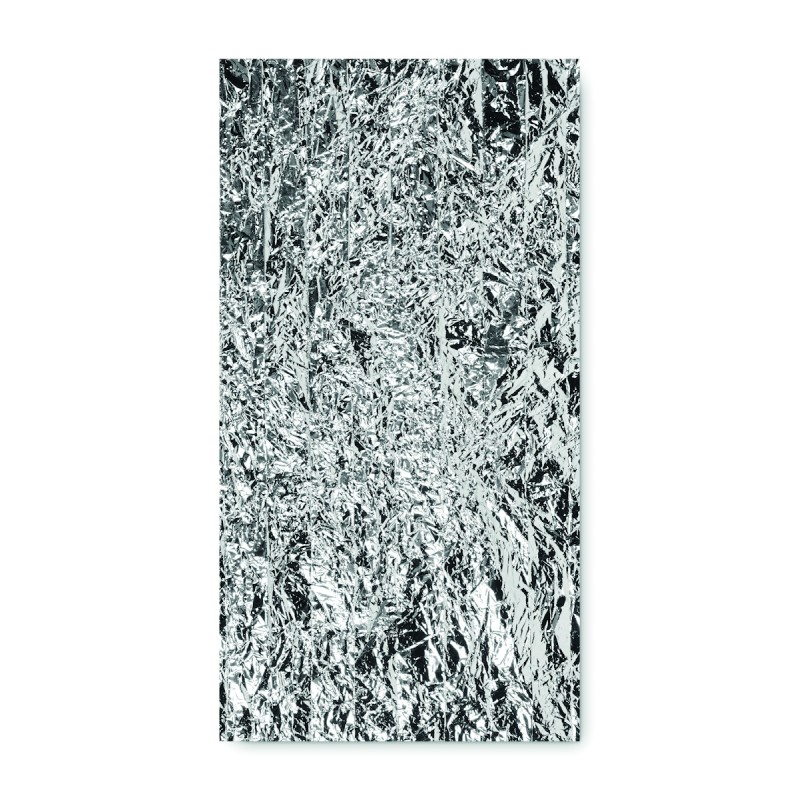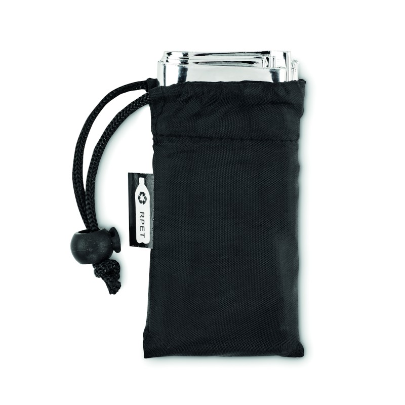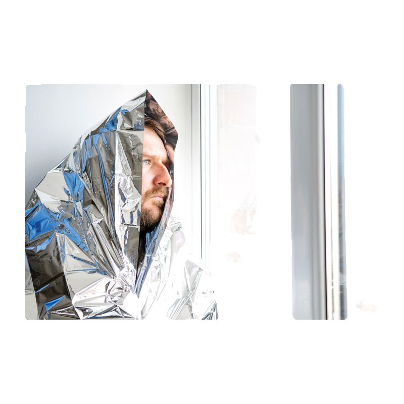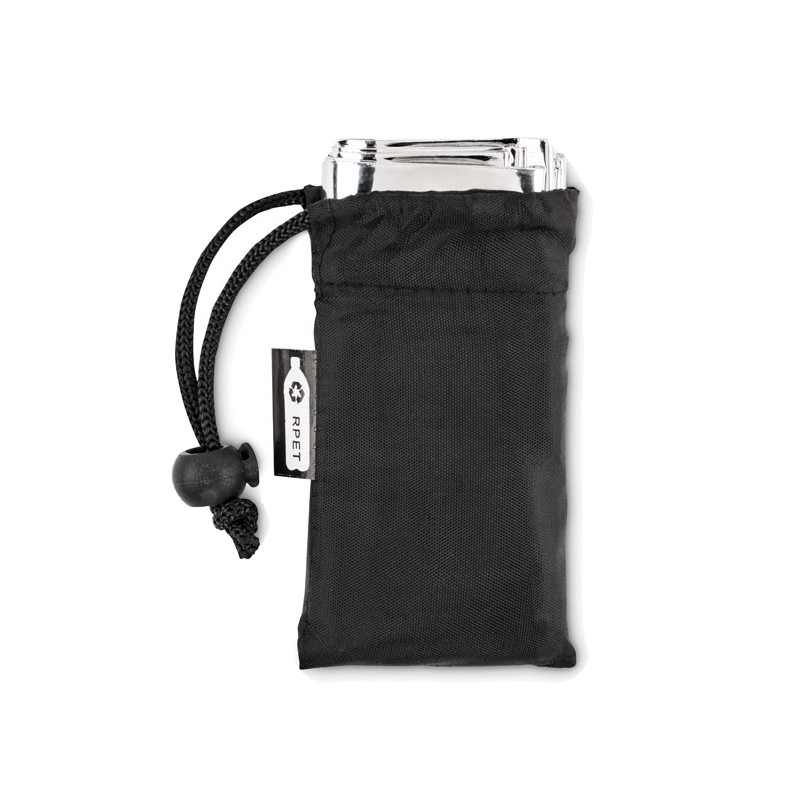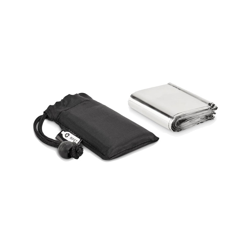 Couverture d'urgence dans une pochette à cordon en polyester RPET. Taille de la couverture : 130 x 210 cm.