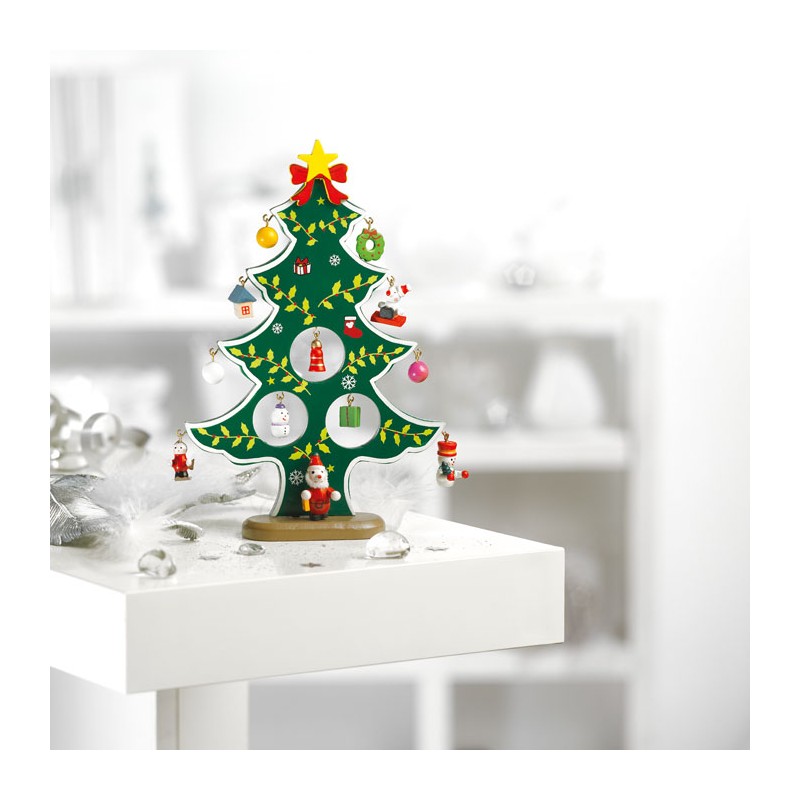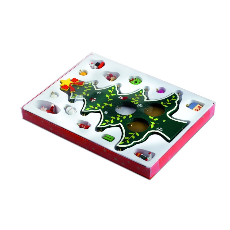 Sapin de Noël en bois avec 12 petites décorations á accrocher. Livrée en boite avec couvercle transparent.