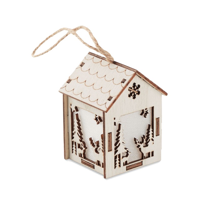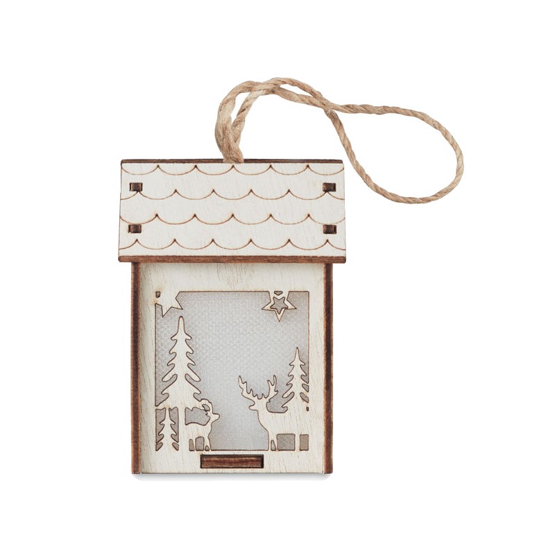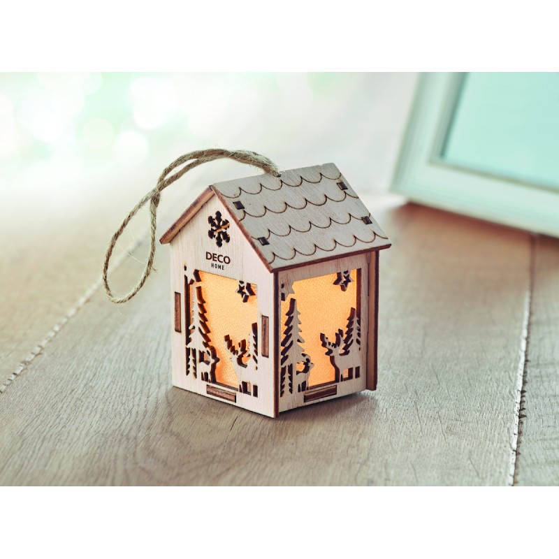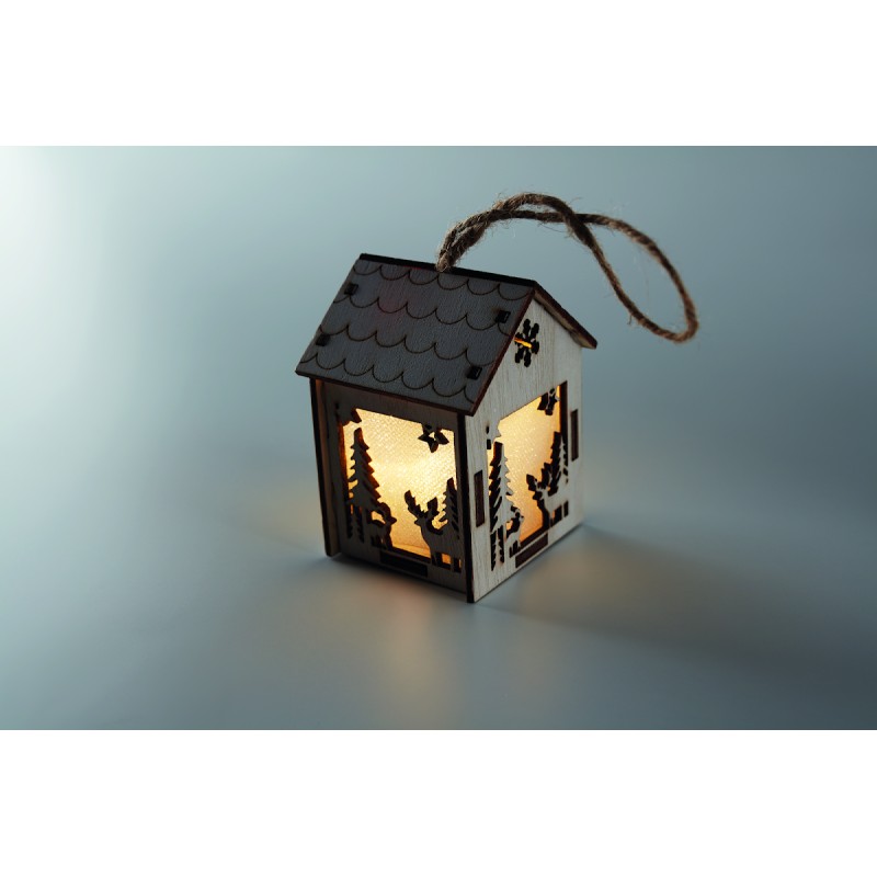 Maison décorée en MDF avec lumière intérieure avec ornements de Noël et cordon de suspension. Comprend 3 piles AG10.