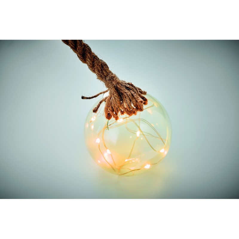 Boule en verre (Ø 8 cm) avec guirlande lumineuse de 8 LED jaune chaud et corde de jute. 2 piles AA non comprises.