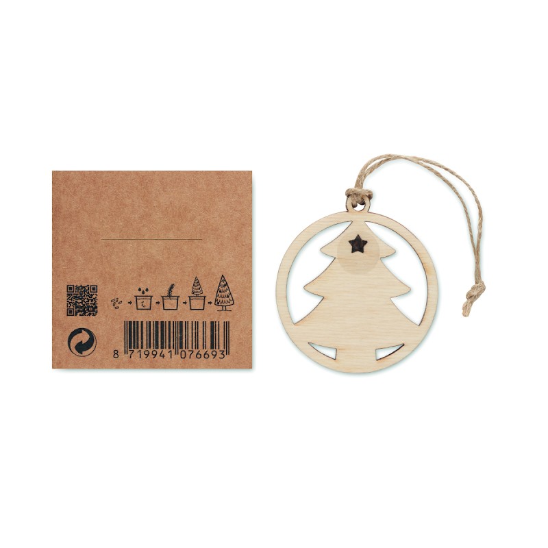 Suspension en bois en forme d'arbre avec cordon de jute comprenant des graines d'épicéa. Présenté dans une enveloppe kraft.