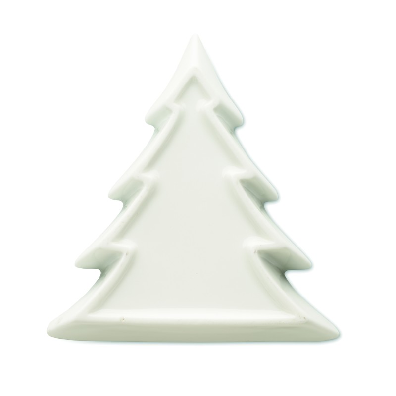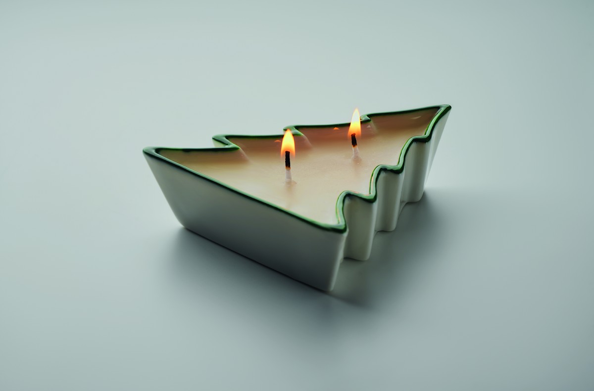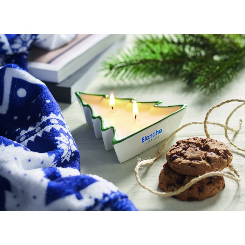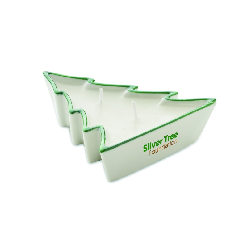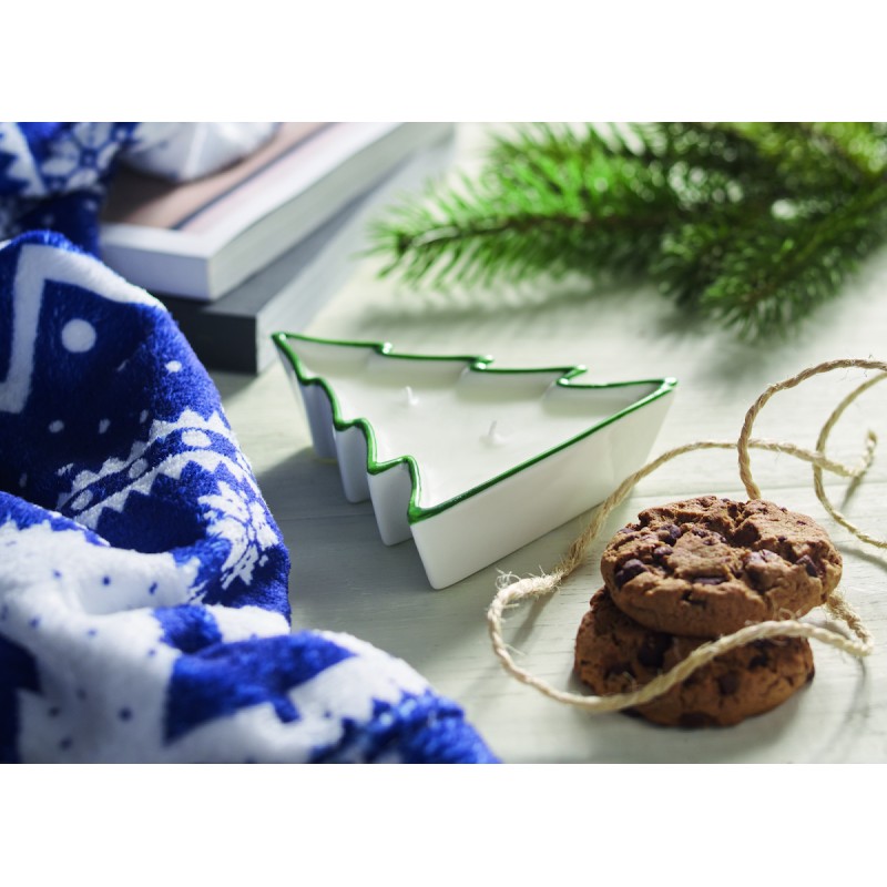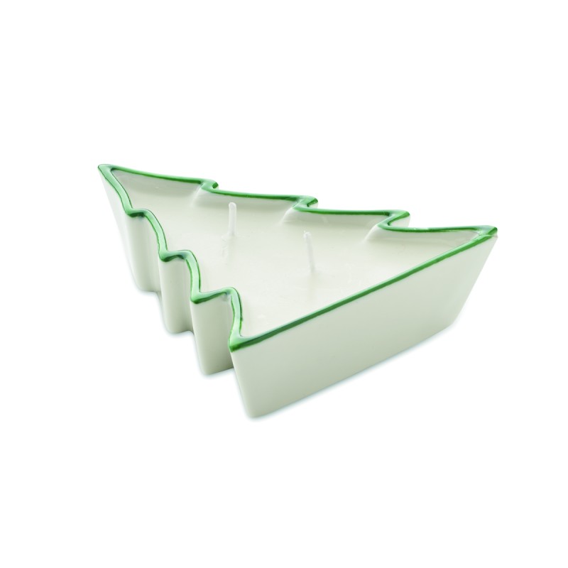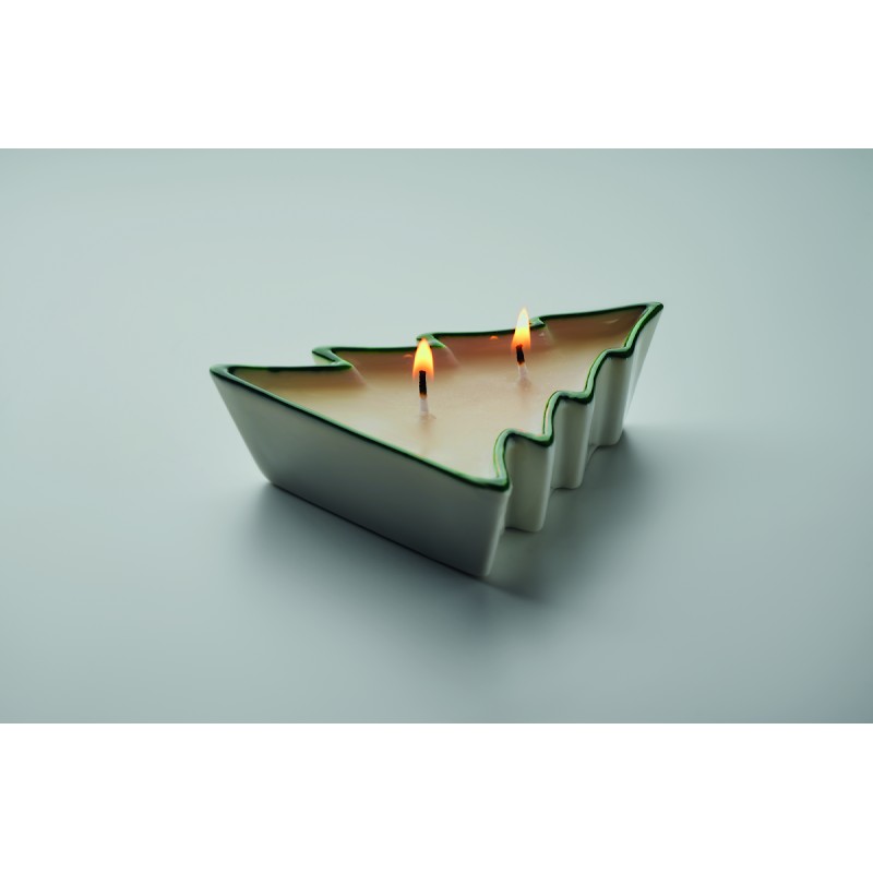 Bougie en cire végétale dans un support en porcelaine en forme de sapin de Noël avec 2 mèches. 60 gr. Durée de combustion : 4 heures.