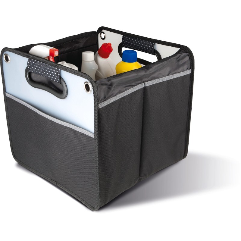 Sac rangement pour coffre avec rabat en polyester 600D, 1 grand compartiment pliant avec fermeture élastique et rabat zippé, poche côté, œillets métalliques sur côtés.