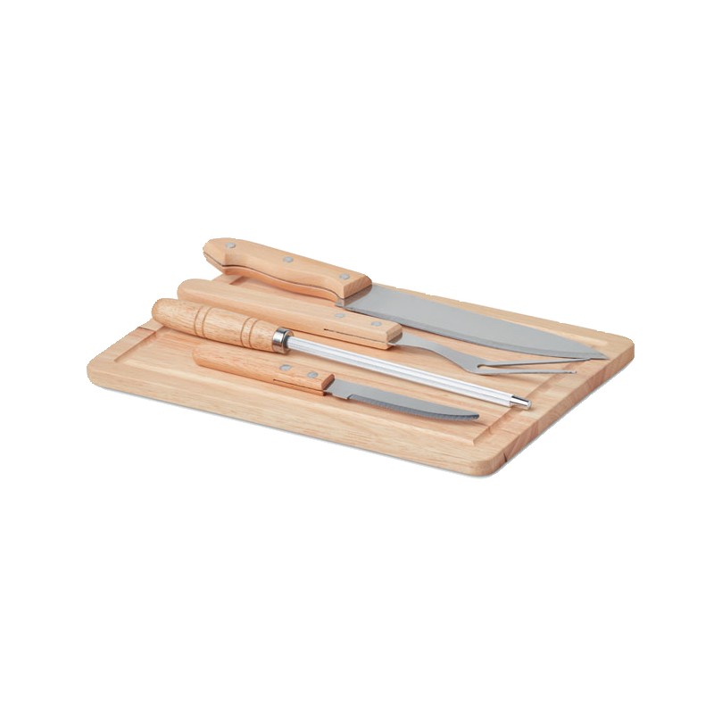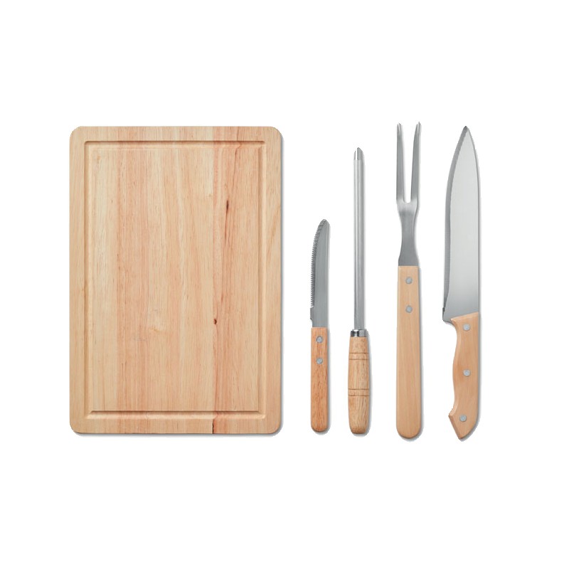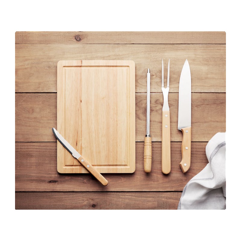Ensemble de 4 accessoires de barbecue en acier inoxydable avec planche à découper dans une pochette en polyester. Comprend un couteau de boucher, un couteau, une fourchette et une barre à aiguiser. Le bambou est un produit naturel, et présente de légères variations de couleur, de décoration et de tailles.
