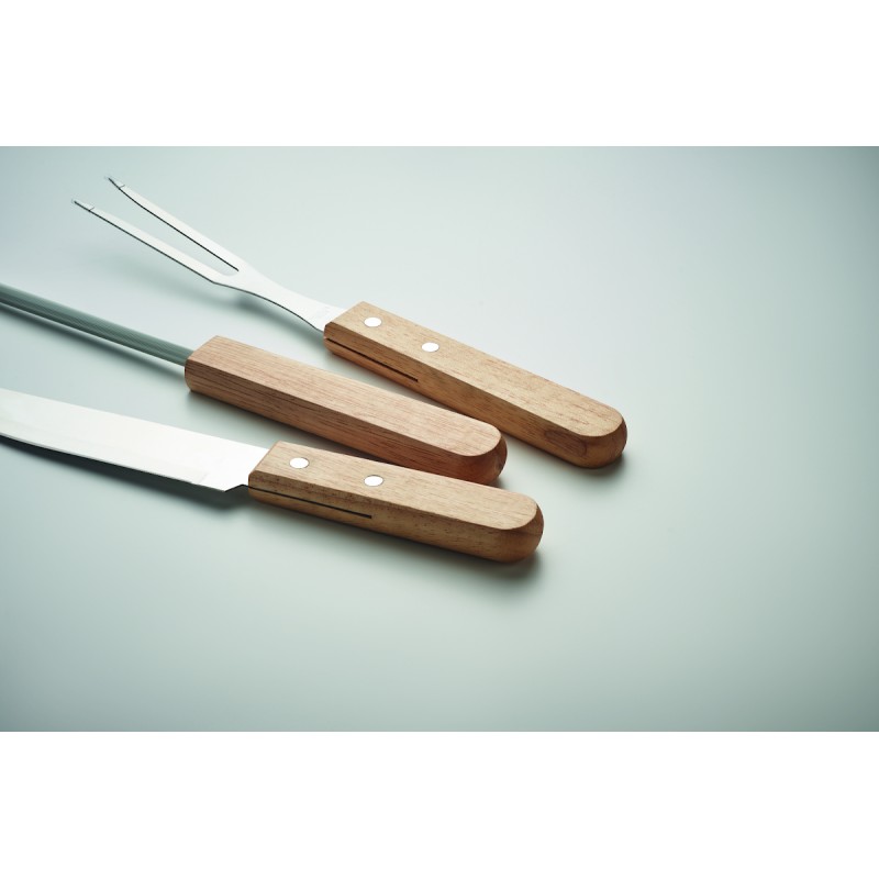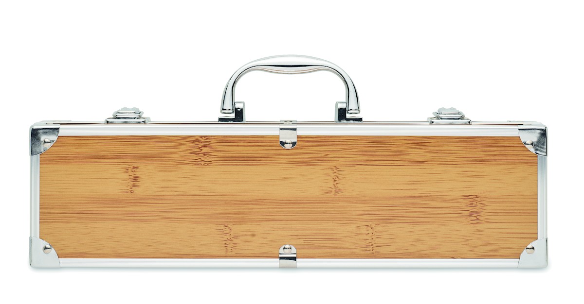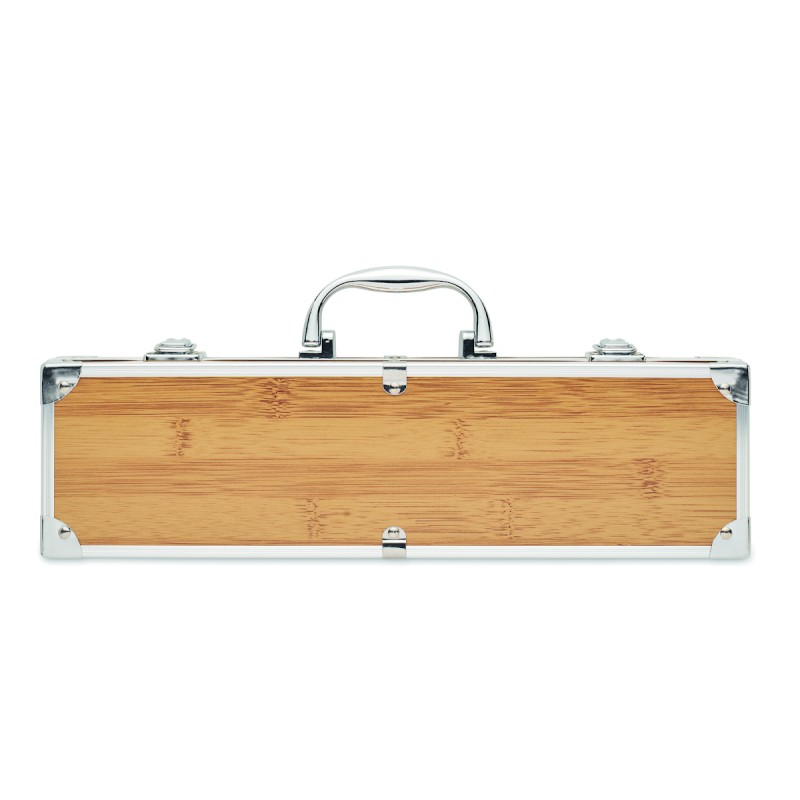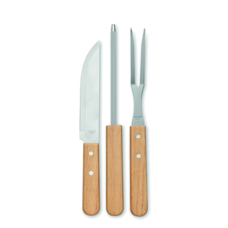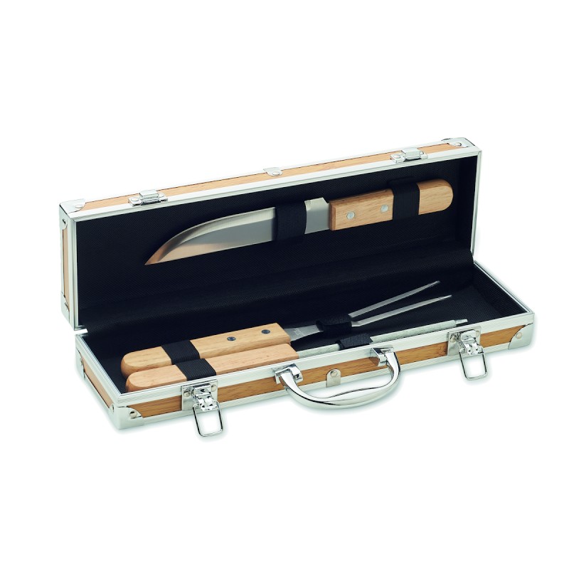 Set de 3 ustensiles de barbecue en acier inoxydable. Couteau, fourchette et aiguisoir avec manches en bois dans un coffret en aluminium. Présenté dans un coffret en aluminium à l'aspect bois.