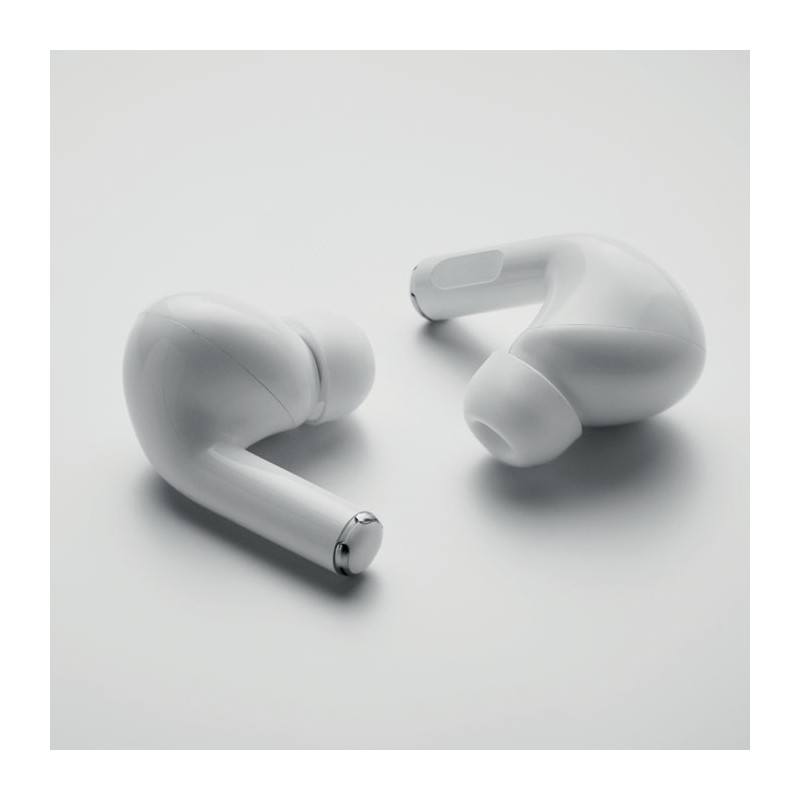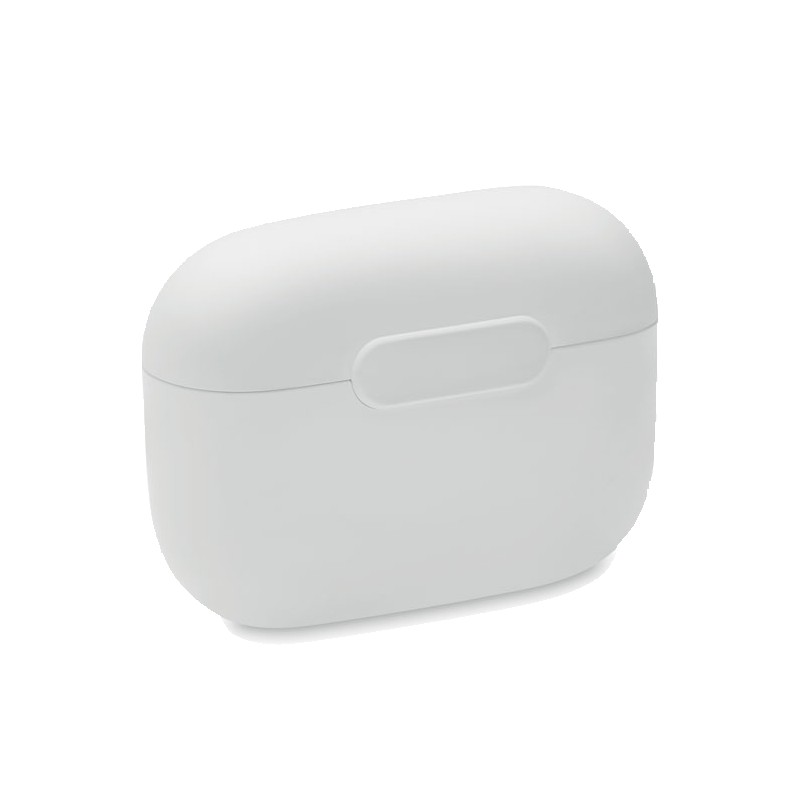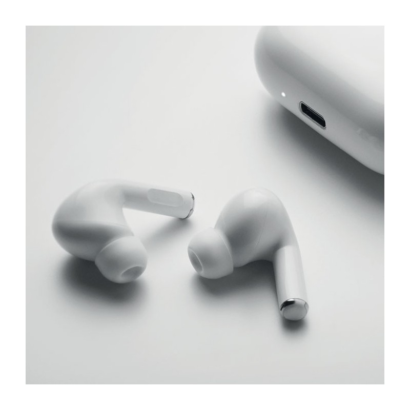 Ecouteurs sans fil (TWS) 5.3 en ABS avec micro et batterie intégrée de 30 mAh. Durée d'utilisation : env. 3h. Entrée Type-C. Appairage auto. Câble charge type C et station de charge de 180 mAh inclus.