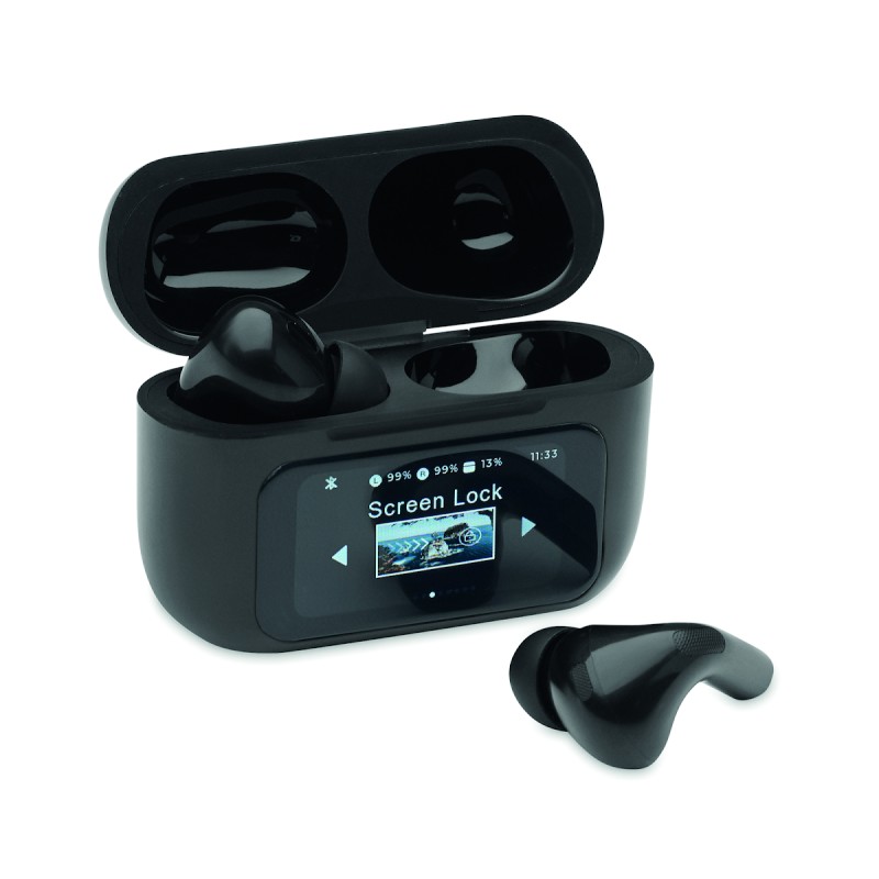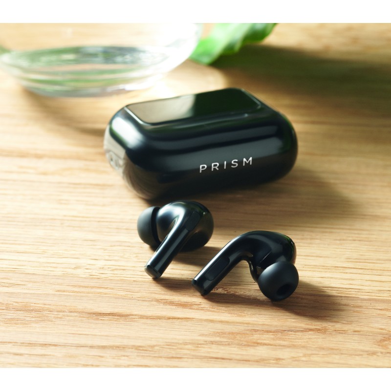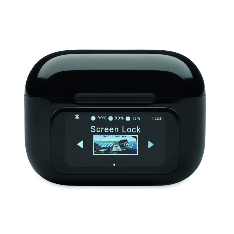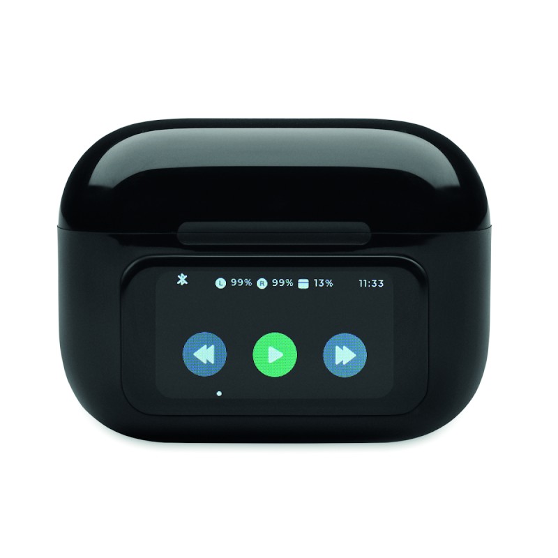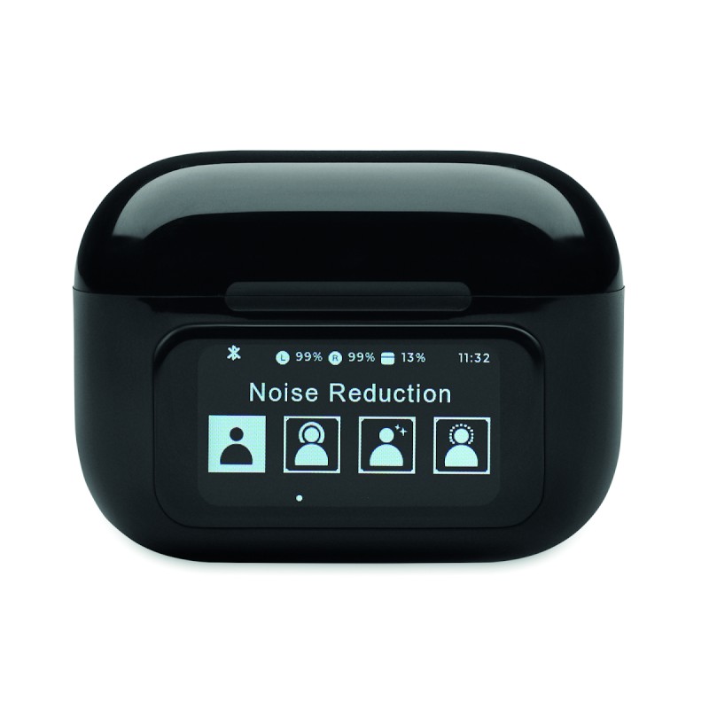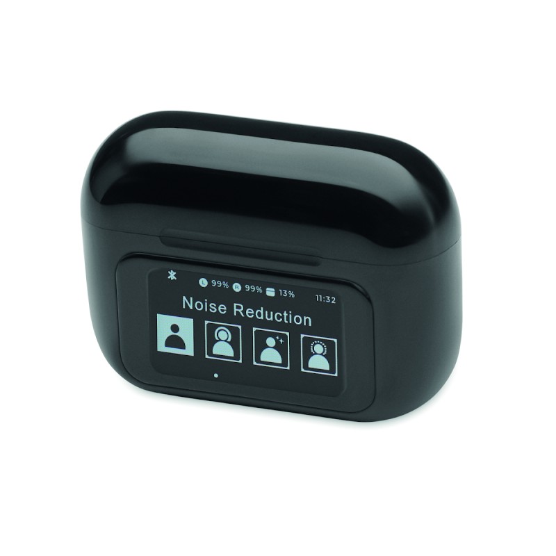 Oreillettes stéréo sans fil True Wireless Stereo (TWS) 5.0 en ABS (30 mAh) avec ANC/ENC et microphone et base de chargement 230 mAh. Commande sur écran tactile.