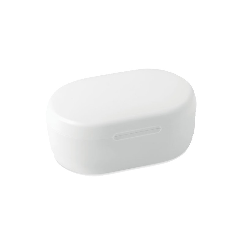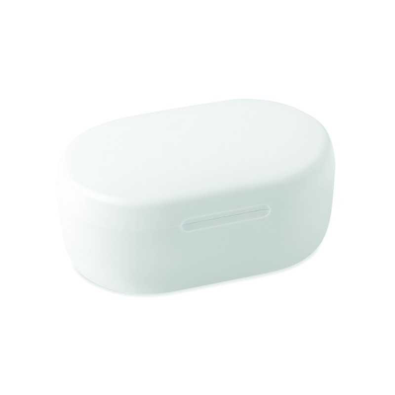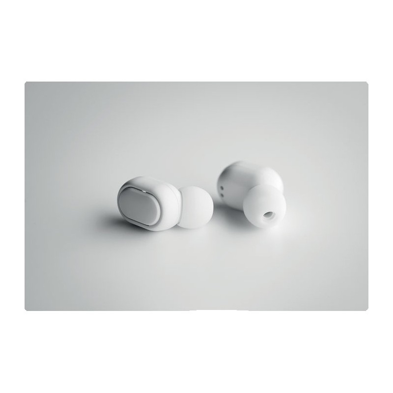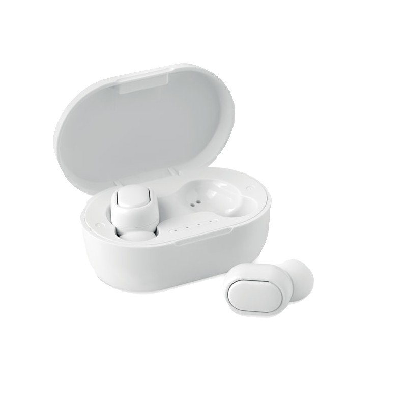 Oreillettes stéréo sans fil (TWS) 5.3 en ABS recyclé avec microphone et batterie 40 mAh intégrée. Durée d'écoute d'environ 4 heures. Appairage automatique. Câble de charge micro USB et station de charge 300 mAh inclus.