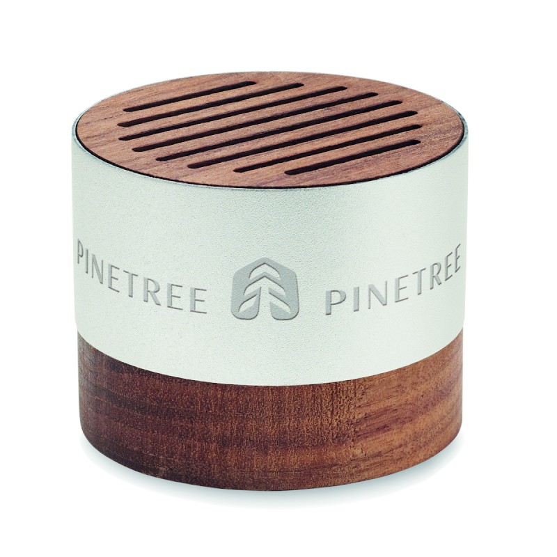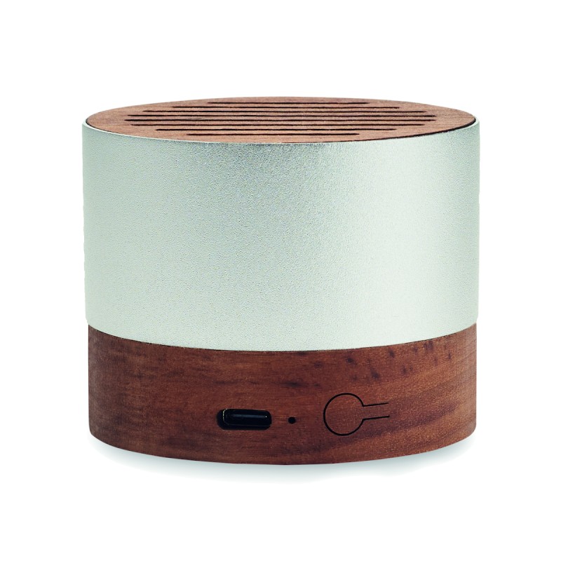 Enceinte sans fil 5.3 dans un boîtier en aluminium recyclé avec une base et une partie supérieure en noyer. 1 Batterie rechargeable Li-ION 300 mAh incluse. Données de sortie : 3W, 3 Ohm et 5V. Durée d'écoute d'environ 3 heures.