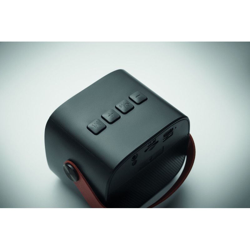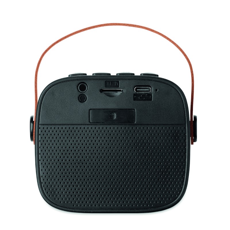 Haut-parleur 5.0 sans fil en ABS recyclé avec poignée en PU. 1 Batterie rechargeable Li-ION 500 mAh incluse. Comprend un port pour carte SD et un câble AUX/USB. Données de sortie : 5W, 3 Ohm et 5V. Durée d'écoute d'environ 4 heures.