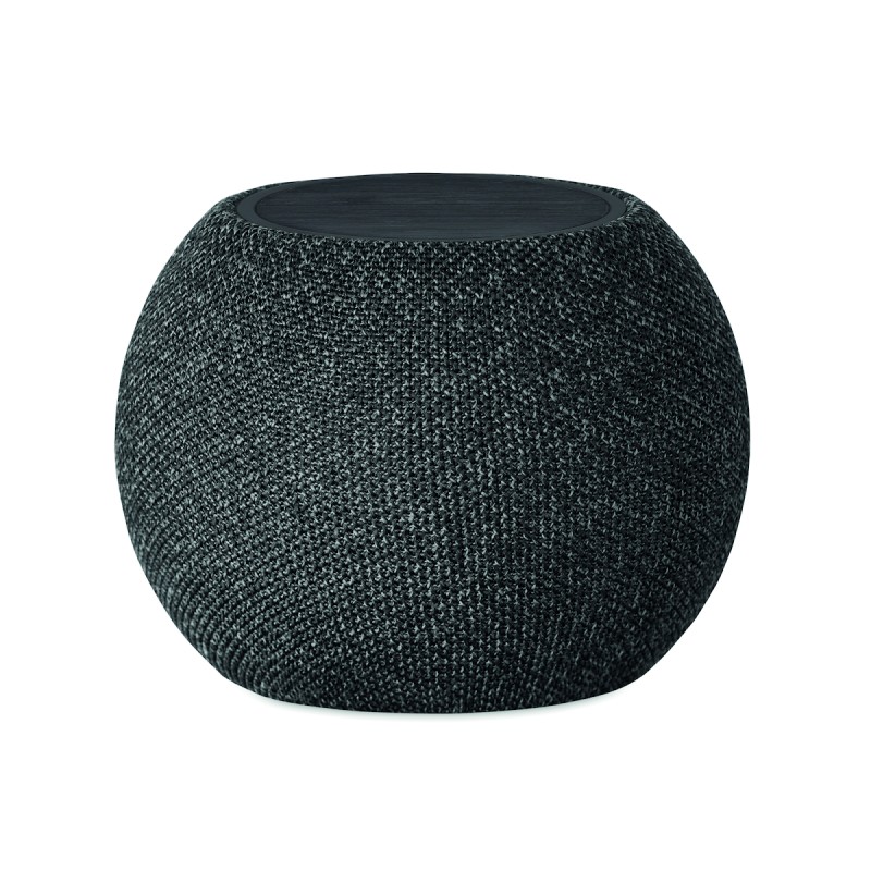 Haut-parleur 5.0 sans fil 0 et charge sans fil 15W en ABS et tissu RPET avec détails en bambou noir. 1 Batterie rechargeable Li-ION 1200 mAh incluse. Comprend un port pour carte SD et un câble AUX/USB. Données de sortie : 3W, 3 Ohm et 5V. Durée de lecture : environ 5 heures.